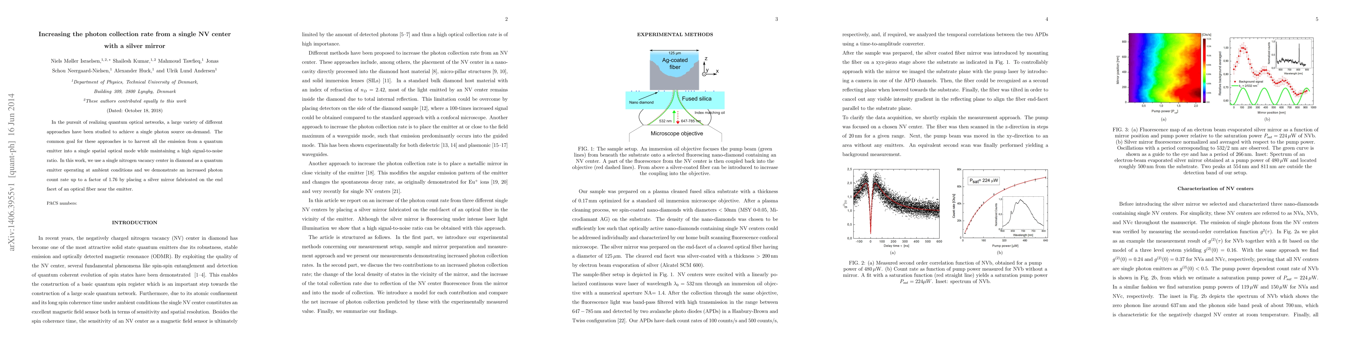 This study enhances the photon collection efficiency from a single NV center in diamond by a factor of 1.76 using a silver mirror on an optical fiber, aiming to improve the performance of on-demand single photon sources for quantum optical networks.