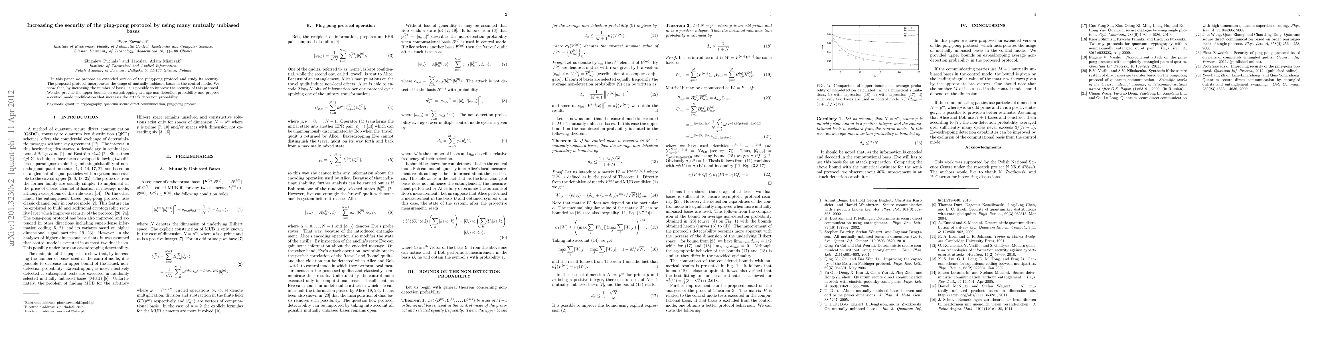This paper proposes an enhanced version of the ping-pong protocol that uses multiple mutually unbiased bases to improve security. It demonstrates that increasing the number of bases reduces eavesdropping risks and provides modifications to boost attack detection probability.