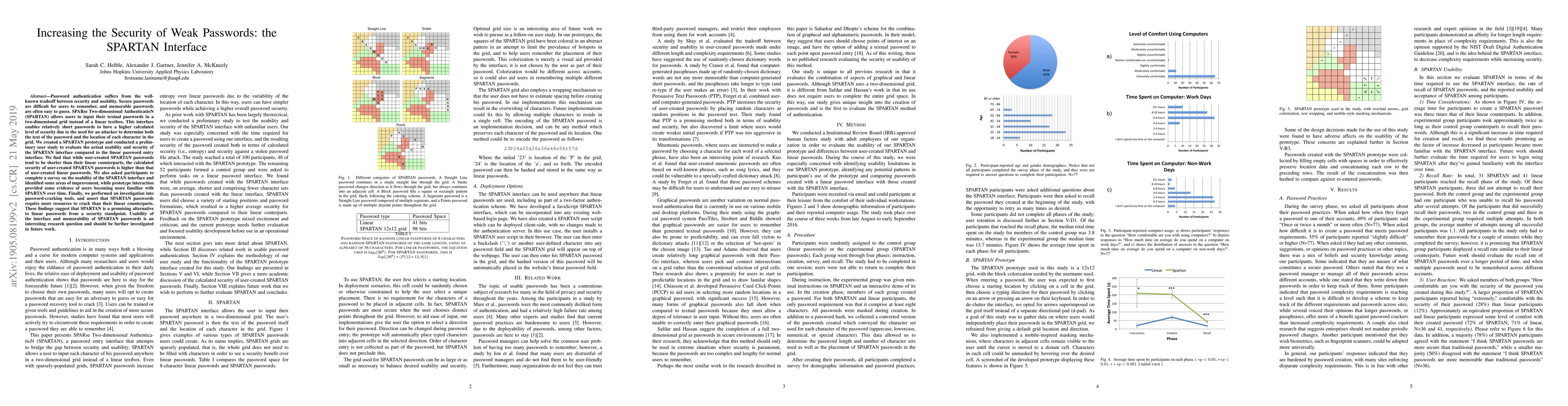 The SPARTAN interface enhances password security by allowing users to input textual passwords in a two-dimensional grid, increasing security due to the need for both text and location knowledge. Preliminary studies show SPARTAN passwords are shorter yet more secure than linear passwords, though usability improvements are needed.