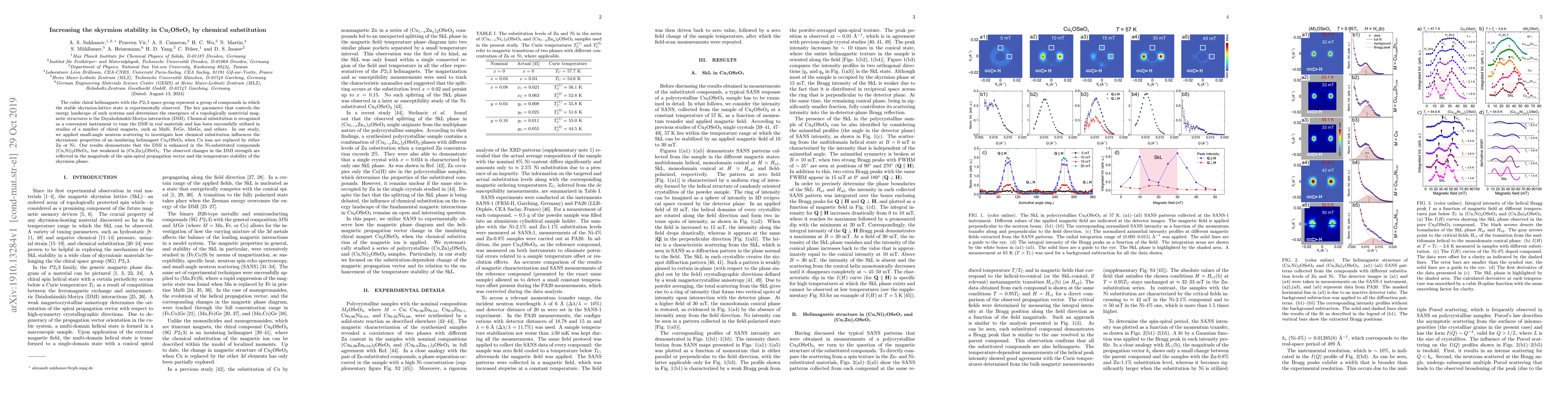 This study investigates the impact of chemical substitution on the skyrmion stability in Cu$_2$OSeO$_3$ by replacing Cu with Zn or Ni. Results show that Ni substitution enhances the Dzyaloshinskii-Moriya interaction, increasing skyrmion stability, while Zn substitution weakens it, affecting the spin-spiral propagation vector and skyrmion phase temperature stability.
