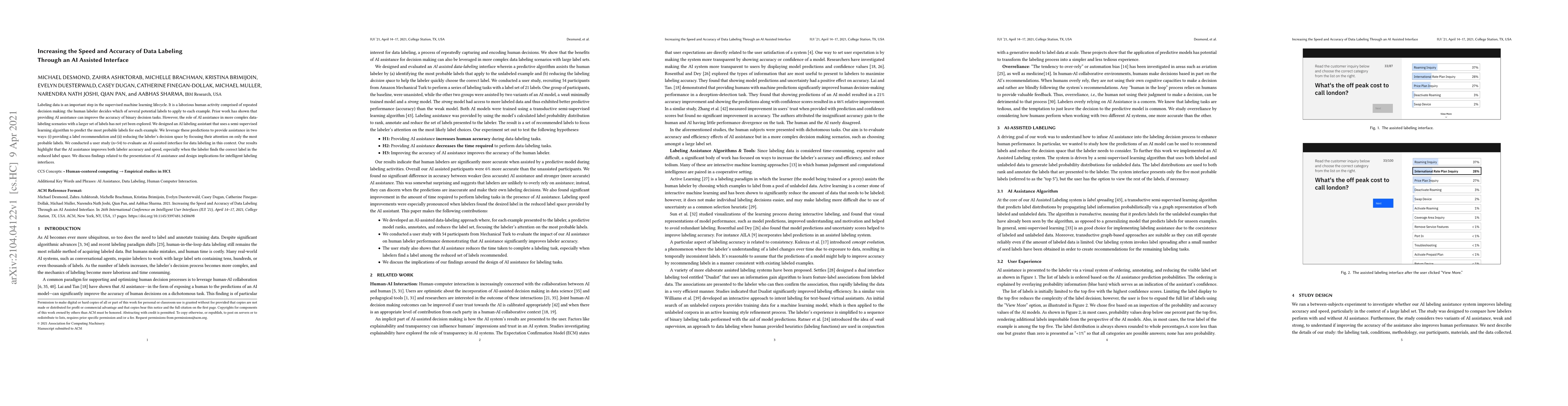 The paper presents an AI-assisted data labeling interface that uses a semi-supervised learning algorithm to predict the most probable labels, improving both labeler accuracy and speed.