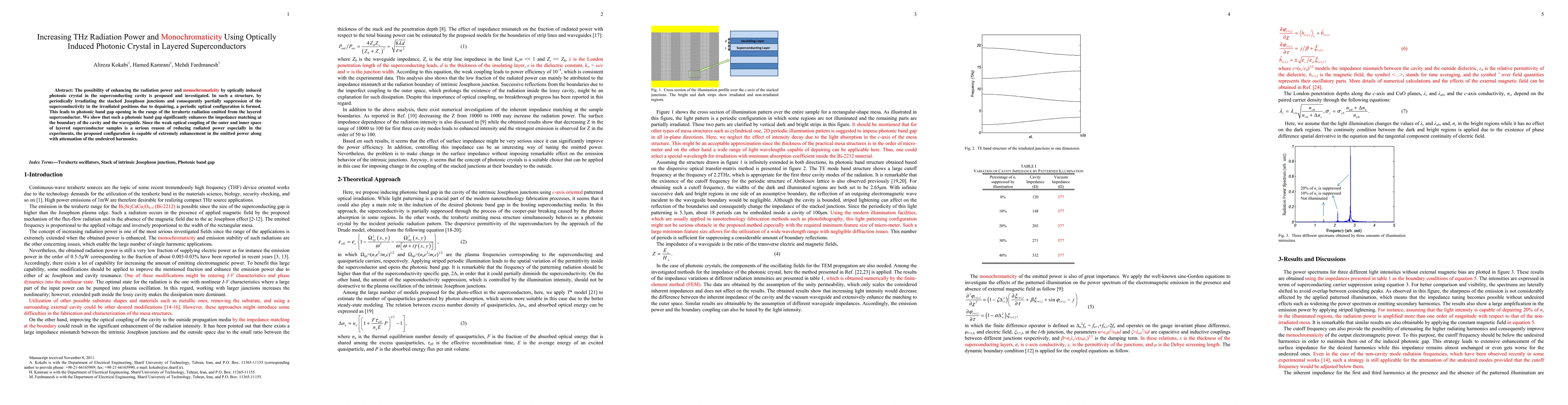 The possibility of enhancing the radiation power and monochromaticity by optically induced photonic crystal in the superconducting cavity is proposed and investigated. In such a structure, by periodically irradiating the stacked Josephson junctions and consequently partially suppression of the superconductivity in the irradiated positions due to depairing, a periodic optical configuration is formed. This leads to photonic band gap opening in the range of the terahertz radiation emitted from the layered superconductor. We show that such a photonic band gap significantly enhances the impedance matching at the boundary of the cavity and the waveguide. Since the weak optical coupling of the outer and inner space of layered superconductor samples is a serious reason of reducing radiated power especially in the experiments, the proposed configuration is capable of extremely enhancement in the emitted power along with attenuation of the undesired harmonics.