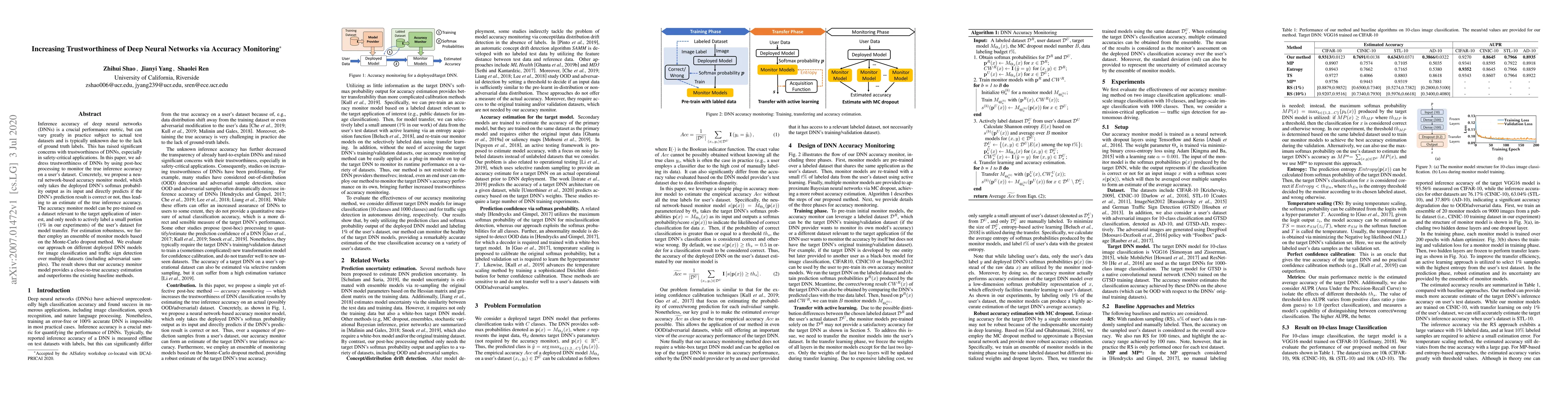 Inference accuracy of deep neural networks (DNNs) is a crucial performance metric, but can vary greatly in practice subject to actual test datasets and is typically unknown due to the lack of ground truth labels. This has raised significant concerns with trustworthiness of DNNs, especially in safety-critical applications. In this paper, we address trustworthiness of DNNs by using post-hoc processing to monitor the true inference accuracy on a user's dataset. Concretely, we propose a neural network-based accuracy monitor model, which only takes the deployed DNN's softmax probability output as its input and directly predicts if the DNN's prediction result is correct or not, thus leading to an estimate of the true inference accuracy. The accuracy monitor model can be pre-trained on a dataset relevant to the target application of interest, and only needs to actively label a small portion (1% in our experiments) of the user's dataset for model transfer. For estimation robustness, we further employ an ensemble of monitor models based on the Monte-Carlo dropout method. We evaluate our approach on different deployed DNN models for image classification and traffic sign detection over multiple datasets (including adversarial samples). The result shows that our accuracy monitor model provides a close-to-true accuracy estimation and outperforms the existing baseline methods.