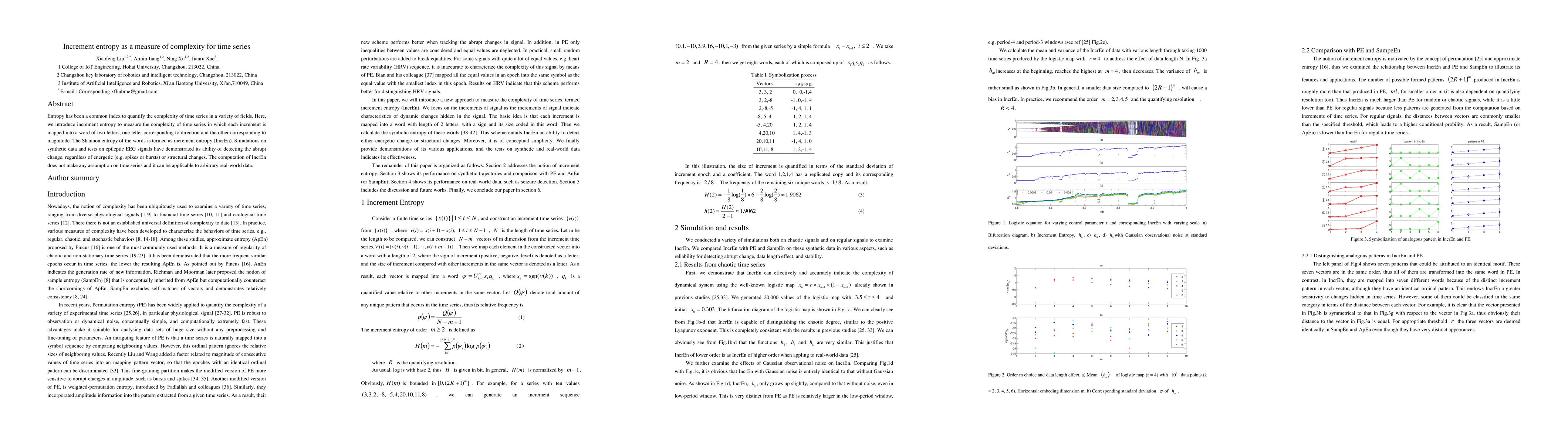 This paper introduces increment entropy (IncrEn) as a novel measure for time series complexity, mapping each increment into a two-letter word representing direction and magnitude. IncrEn, based on Shannon entropy, effectively detects abrupt changes in data, demonstrated through synthetic and epileptic EEG signal analyses.