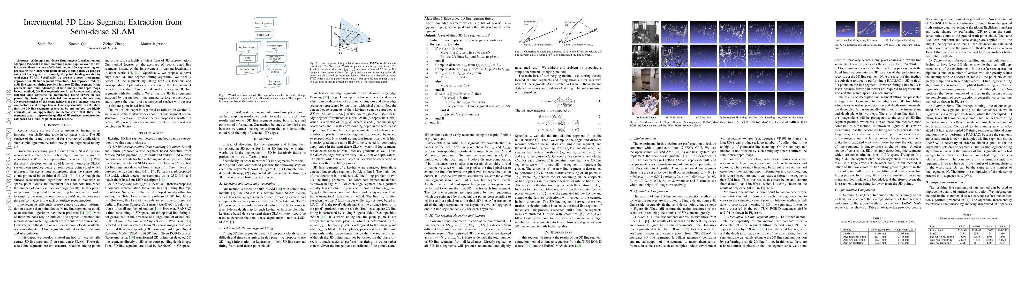 Although semi-dense Simultaneous Localization and Mapping (SLAM) has been becoming more popular over the last few years, there is a lack of efficient methods for representing and processing their large scale point clouds. In this paper, we propose using 3D line segments to simplify the point clouds generated by semi-dense SLAM. Specifically, we present a novel incremental approach for 3D line segment extraction. This approach reduces a 3D line segment fitting problem into two 2D line segment fitting problems and takes advantage of both images and depth maps. In our method, 3D line segments are fitted incrementally along detected edge segments via minimizing fitting errors on two planes. By clustering the detected line segments, the resulting 3D representation of the scene achieves a good balance between compactness and completeness. Our experimental results show that the 3D line segments generated by our method are highly accurate. As an application, we demonstrate that these line segments greatly improve the quality of 3D surface reconstruction compared to a feature point based baseline.