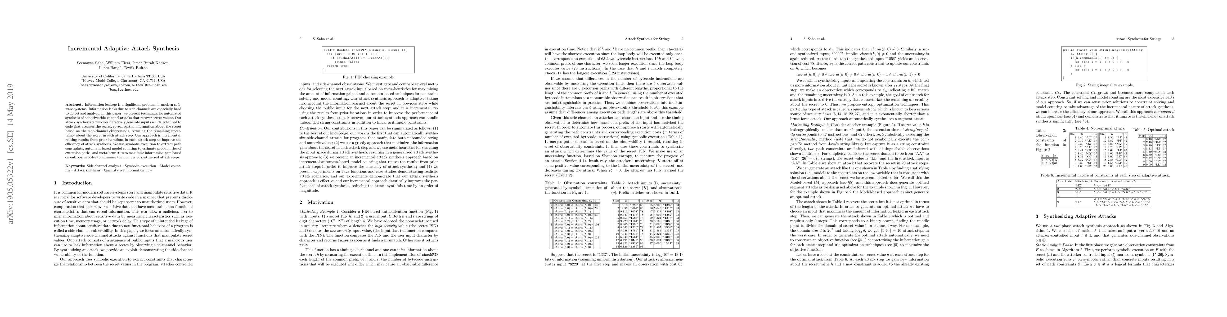 This paper introduces techniques for automated synthesis of adaptive side-channel attacks to recover secret values. The incremental adaptive approach iteratively refines attacks by reusing prior results to minimize uncertainty and maximize information gain through symbolic execution and meta-heuristics.