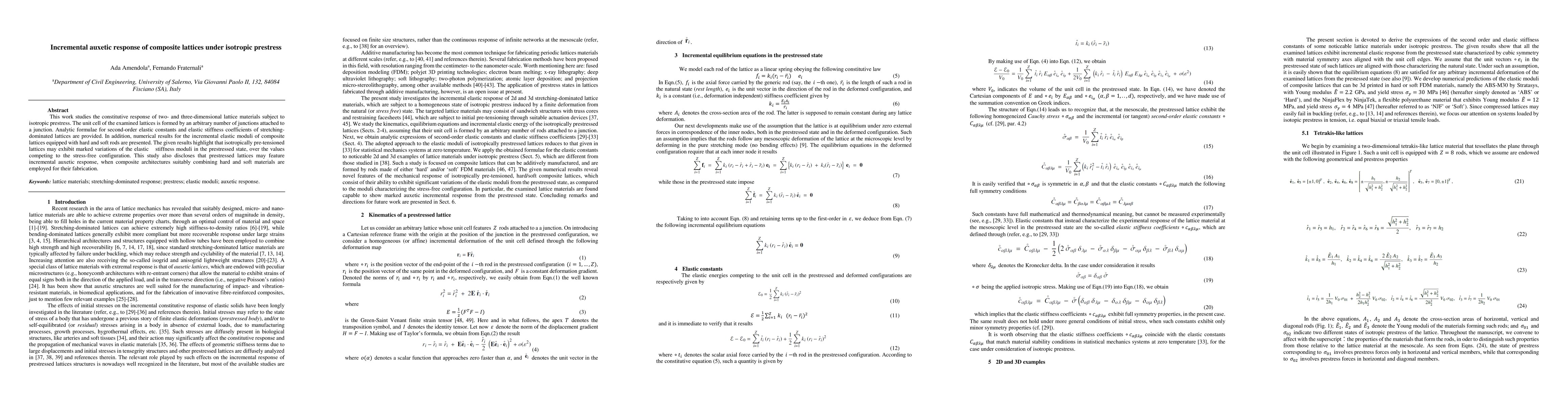 This research investigates the elastic behavior of lattice materials under isotropic prestress, providing analytic and numerical results on the incremental auxetic response of composite lattices. It reveals that prestressed lattices can exhibit significant changes in elastic stiffness and may display auxetic behavior when combining hard and soft rods.