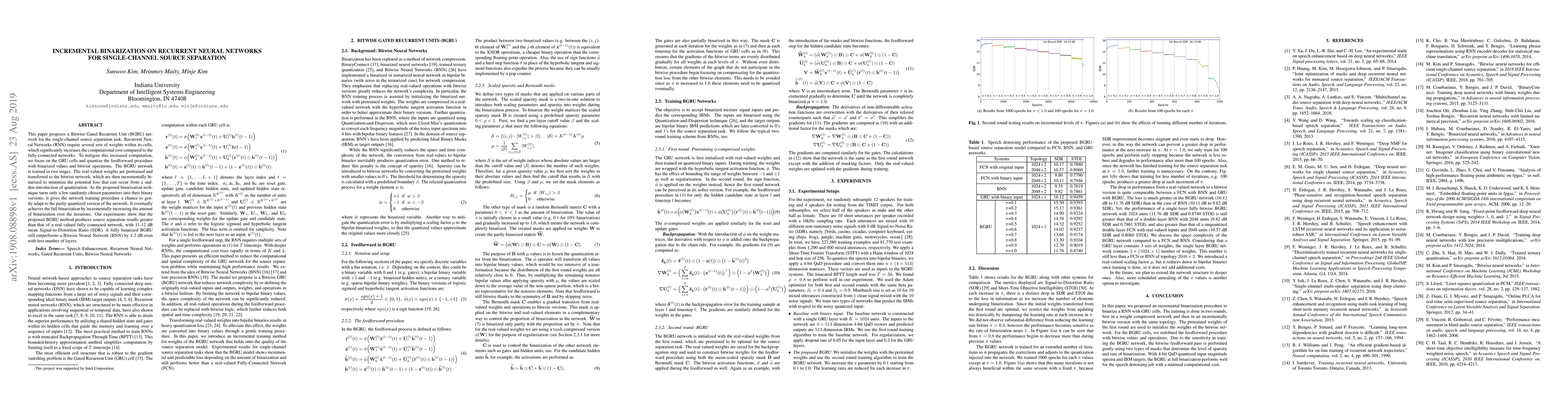 This paper introduces a Bitwise Gated Recurrent Unit (BGRU) network for single-channel source separation, employing incremental binarization to reduce computational costs while maintaining high performance. The BGRU achieves superior separation results compared to fully connected networks and outperforms bitwise neural networks despite fewer layers.
