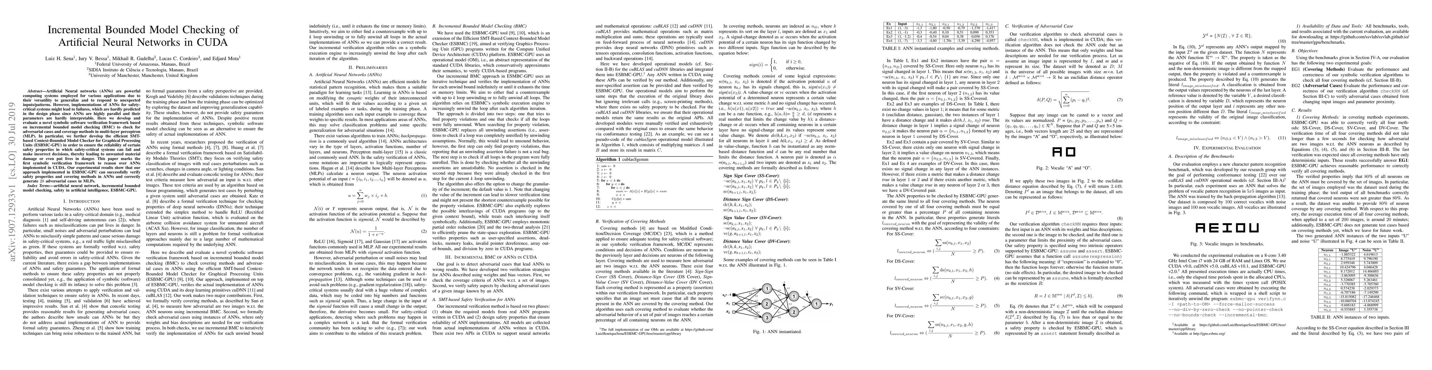 Artificial Neural networks (ANNs) are powerful computing systems employed for various applications due to their versatility to generalize and to respond to unexpected inputs/patterns. However, implementations of ANNs for safety-critical systems might lead to failures, which are hardly predicted in the design phase since ANNs are highly parallel and their parameters are hardly interpretable. Here we develop and evaluate a novel symbolic software verification framework based on incremental bounded model checking (BMC) to check for adversarial cases and coverage methods in multi-layer perceptron (MLP). In particular, we further develop the efficient SMT-based Context-Bounded Model Checker for Graphical Processing Units (ESBMC-GPU) in order to ensure the reliability of certain safety properties in which safety-critical systems can fail and make incorrect decisions, thereby leading to unwanted material damage or even put lives in danger. This paper marks the first symbolic verification framework to reason over ANNs implemented in CUDA. Our experimental results show that our approach implemented in ESBMC-GPU can successfully verify safety properties and covering methods in ANNs and correctly generate 28 adversarial cases in MLPs.