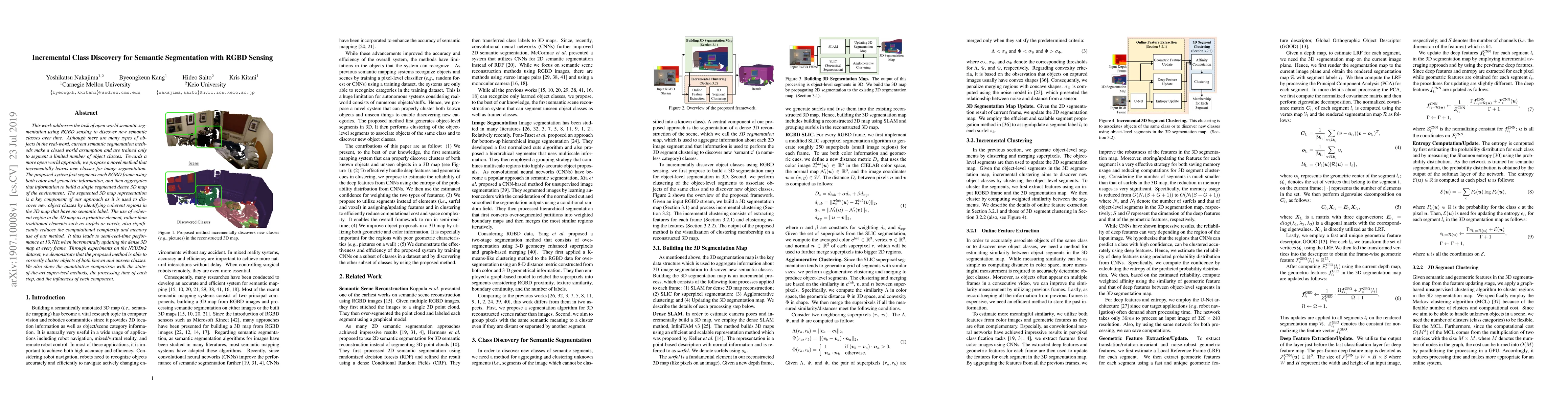 This paper proposes a method for incremental class discovery in semantic segmentation using RGBD sensing, enabling the identification of new object classes over time. The system segments RGBD frames and builds a dense 3D map to discover unlabeled regions, achieving semi-real-time performance and demonstrating effectiveness on the NYUDv2 dataset.