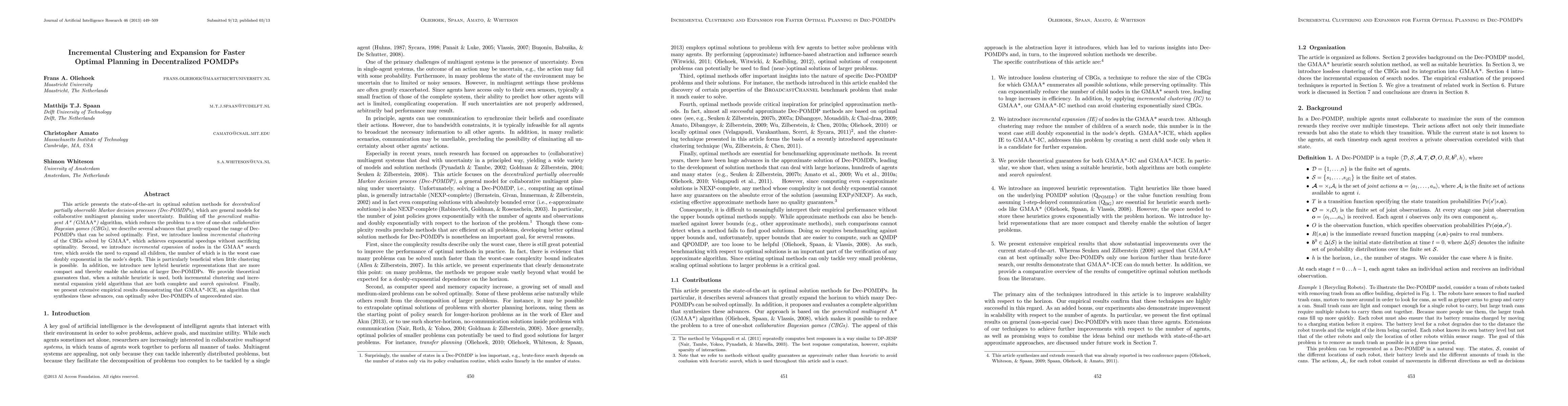 This paper introduces advanced techniques for optimal planning in decentralized partially observable Markov decision processes (Dec-POMDPs), including lossless incremental clustering and incremental expansion, which significantly speed up solutions without sacrificing optimality. The proposed GMAA*-ICE algorithm can solve larger Dec-POMDPs optimally, as demonstrated by extensive empirical results.