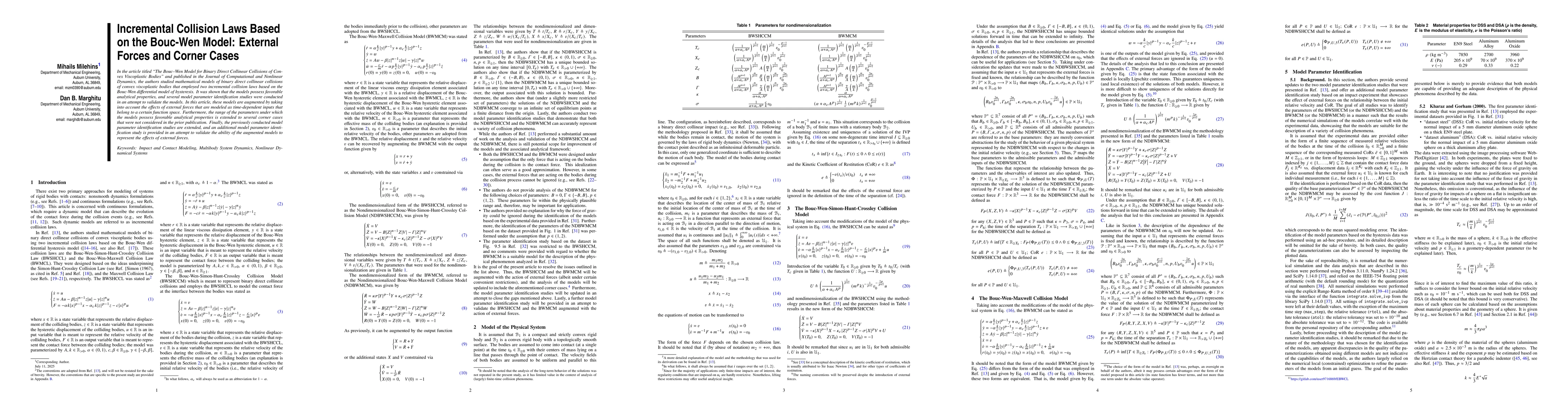 In the article titled "The Bouc-Wen Model for Binary Direct Collinear Collisions of Convex Viscoplastic Bodies" and published in the Journal of Computational and Nonlinear Dynamics, the authors studied mathematical models of binary direct collinear collisions of convex viscoplastic bodies that employed two incremental collision laws based on the Bouc-Wen differential model of hysteresis. It was shown that the models possess favorable analytical properties, and several model parameter identification studies were conducted in an attempt to validate the models. In this article, these models are augmented by taking into account the effects of external forces that are modeled as time-dependent inputs that belong to a certain function space. Furthermore, the range of the parameters under which the models possess favorable analytical properties is extended to several corner cases that were not considered in the prior publication. Finally, the previously conducted model parameter identification studies are extended, and an additional model parameter identification study is provided in an attempt to validate the ability of the augmented models to represent the effects of external forces.