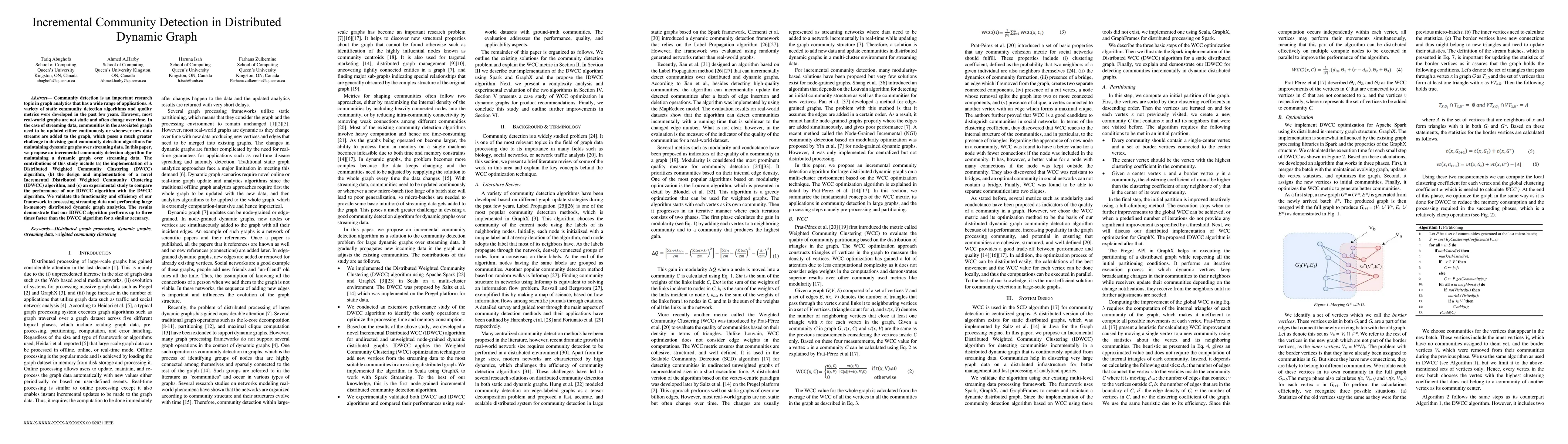 This paper proposes an incremental community detection algorithm, IDWCC, for dynamic graphs in streaming data environments. It introduces a novel Distributed Weighted Community Clustering (DWCC) and compares it with the IDWCC algorithm, showing that IDWCC is up to three times faster while maintaining similar accuracy.