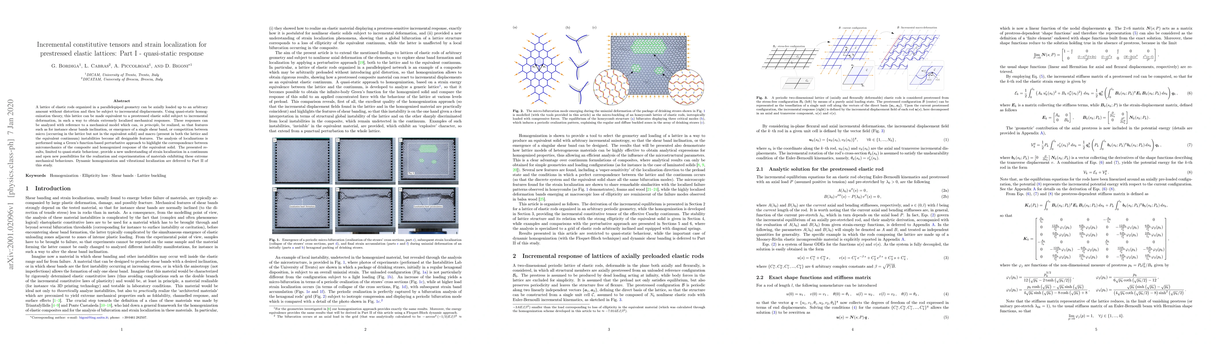 A lattice of elastic rods organized in a parallelepiped geometry can be axially loaded up to an arbitrary amount without distortion and then be subject to incremental displacements. Using quasi-static homogenization theory, this lattice can be made equivalent to a prestressed elastic solid subject to incremental deformation, in such a way to obtain extremely localized mechanical responses. These responses can be analyzed with reference to a mechanical model which can, in principle, be realized, so that features such as for instance shear bands inclination, or emergence of a single shear band, or competition between micro (occurring in the lattice but not in the equivalent solid) and macro (present in both the lattice and the equivalent continuum) instabilities become all designable features. The analysis of localizations is performed using a Green's function-based perturbative approach to highlight the correspondence between micromechanics of the composite and homogenized response of the equivalent solid. The presented results, limited to quasi-static behaviour, provide a new understanding of strain localization in a continuum and open new possibilities for the realization and experimentation of materials exhibiting these extreme mechanical behaviours. Dynamic homogenization and vibrational localization are deferred to Part II of this study.
