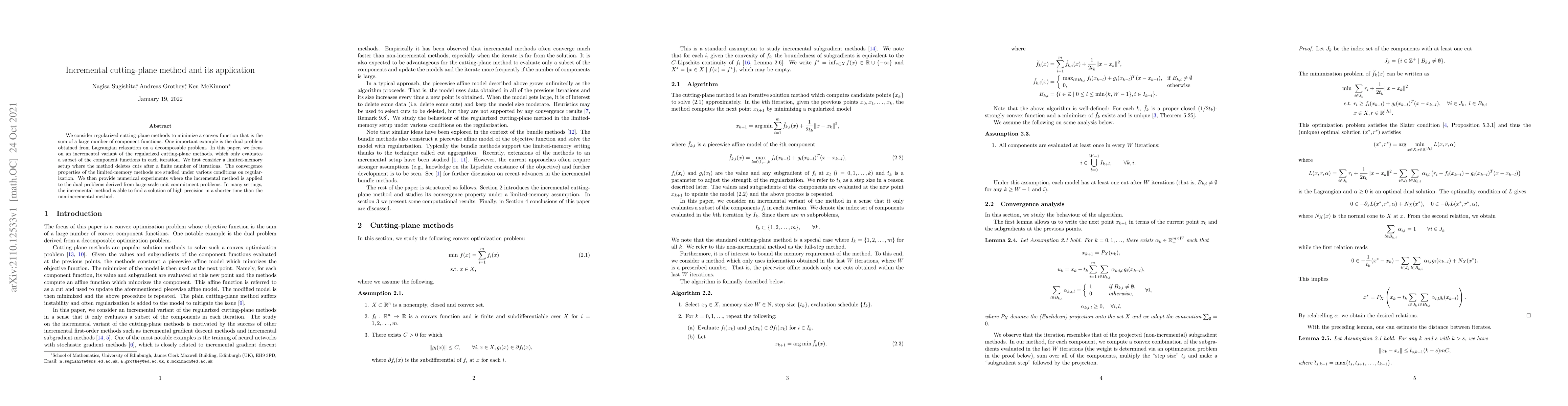 This paper introduces an incremental variant of regularized cutting-plane methods for minimizing convex functions, focusing on a limited-memory setup that evaluates only a subset of component functions per iteration. The method's convergence properties are analyzed under different regularization conditions, and it is shown to outperform non-incremental methods in solving dual problems from large-scale unit commitment problems.