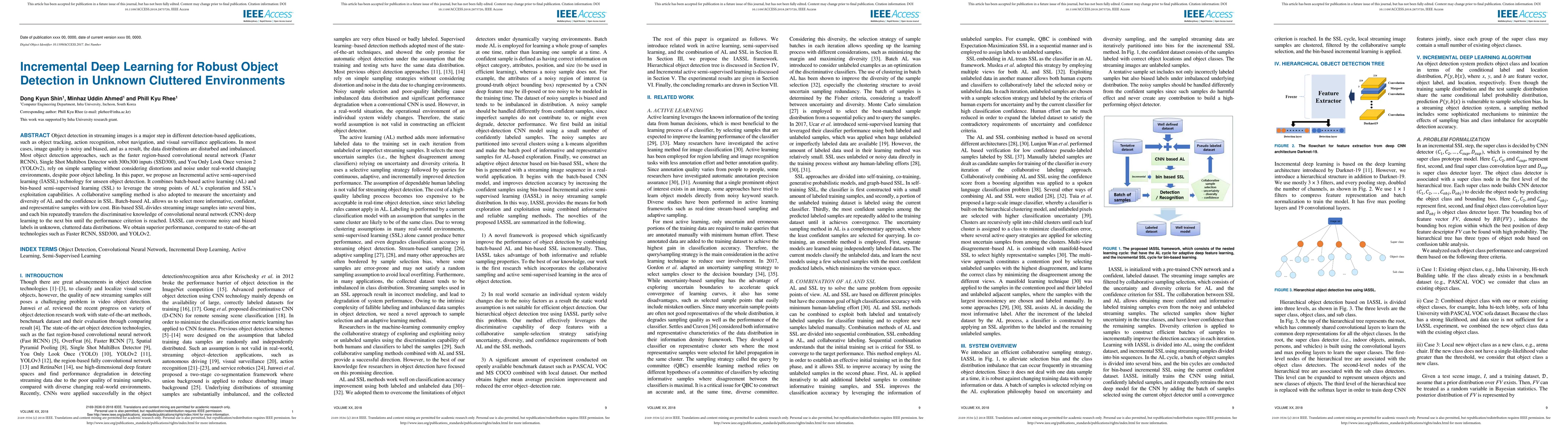 This paper proposes an Incremental active semi-supervised learning (IASSL) technology for robust object detection in cluttered, noisy environments. It combines active learning and semi-supervised learning to improve detection performance despite poor labeling and data distribution shifts, outperforming state-of-the-art methods like Faster RCNN, SSD300, and YOLOv2.