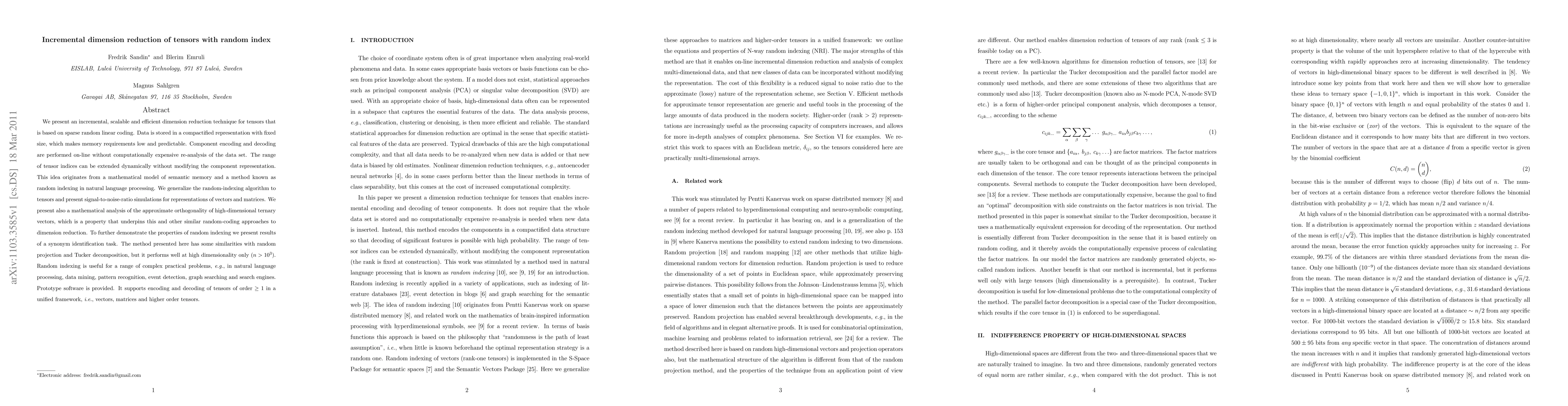 We present an incremental, scalable and efficient dimension reduction technique for tensors that is based on sparse random linear coding. Data is stored in a compactified representation with fixed size, which makes memory requirements low and predictable. Component encoding and decoding are performed on-line without computationally expensive re-analysis of the data set. The range of tensor indices can be extended dynamically without modifying the component representation. This idea originates from a mathematical model of semantic memory and a method known as random indexing in natural language processing. We generalize the random-indexing algorithm to tensors and present signal-to-noise-ratio simulations for representations of vectors and matrices. We present also a mathematical analysis of the approximate orthogonality of high-dimensional ternary vectors, which is a property that underpins this and other similar random-coding approaches to dimension reduction. To further demonstrate the properties of random indexing we present results of a synonym identification task. The method presented here has some similarities with random projection and Tucker decomposition, but it performs well at high dimensionality only (n>10^3). Random indexing is useful for a range of complex practical problems, e.g., in natural language processing, data mining, pattern recognition, event detection, graph searching and search engines. Prototype software is provided. It supports encoding and decoding of tensors of order >= 1 in a unified framework, i.e., vectors, matrices and higher order tensors.