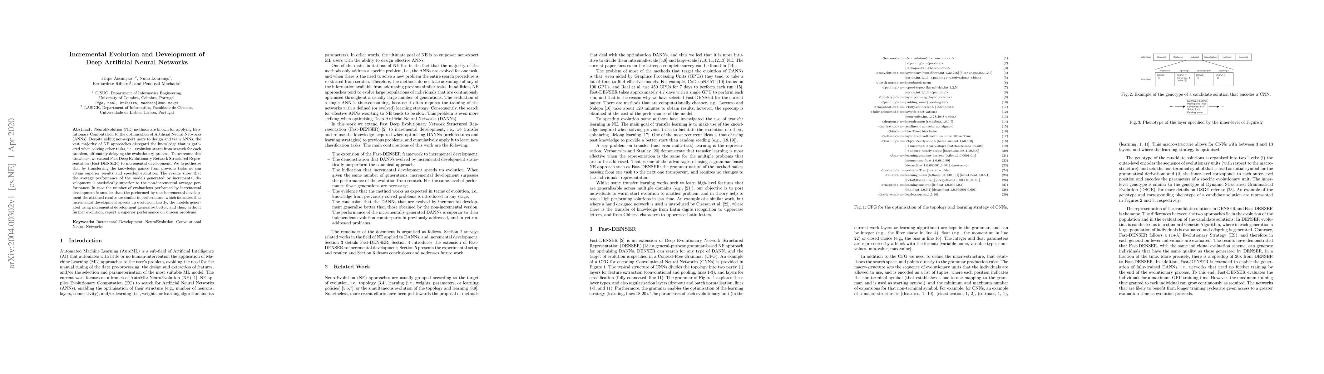 NeuroEvolution (NE) methods are known for applying Evolutionary Computation to the optimisation of Artificial Neural Networks(ANNs). Despite aiding non-expert users to design and train ANNs, the vast majority of NE approaches disregard the knowledge that is gathered when solving other tasks, i.e., evolution starts from scratch for each problem, ultimately delaying the evolutionary process. To overcome this drawback, we extend Fast Deep Evolutionary Network Structured Representation (Fast-DENSER) to incremental development. We hypothesise that by transferring the knowledge gained from previous tasks we can attain superior results and speedup evolution. The results show that the average performance of the models generated by incremental development is statistically superior to the non-incremental average performance. In case the number of evaluations performed by incremental development is smaller than the performed by non-incremental development the attained results are similar in performance, which indicates that incremental development speeds up evolution. Lastly, the models generated using incremental development generalise better, and thus, without further evolution, report a superior performance on unseen problems.