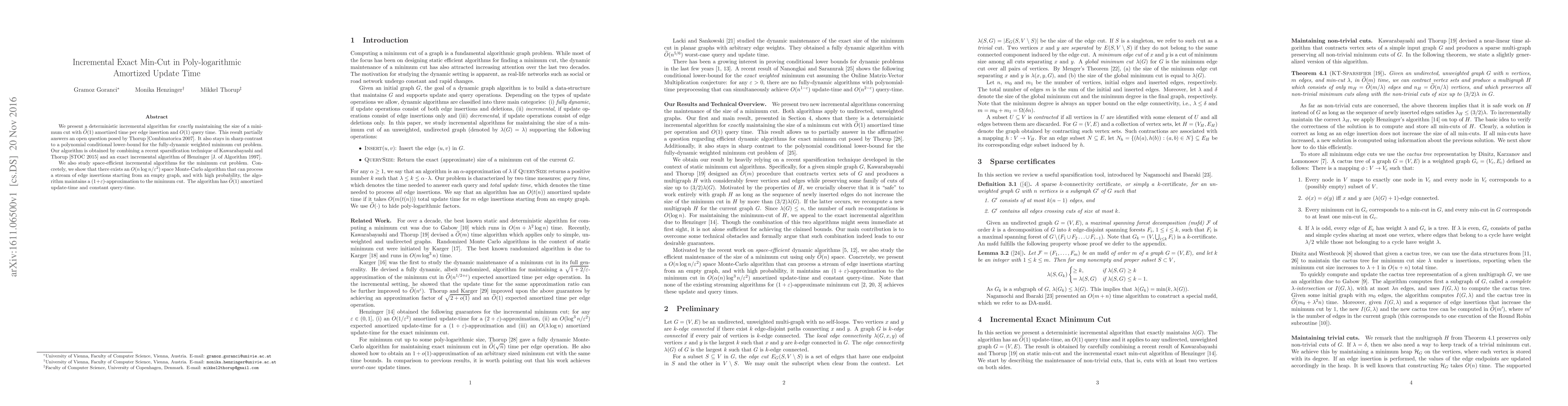 A deterministic algorithm maintains the minimum cut of a graph with O(1) amortized update time per edge insertion and O(1) query time.