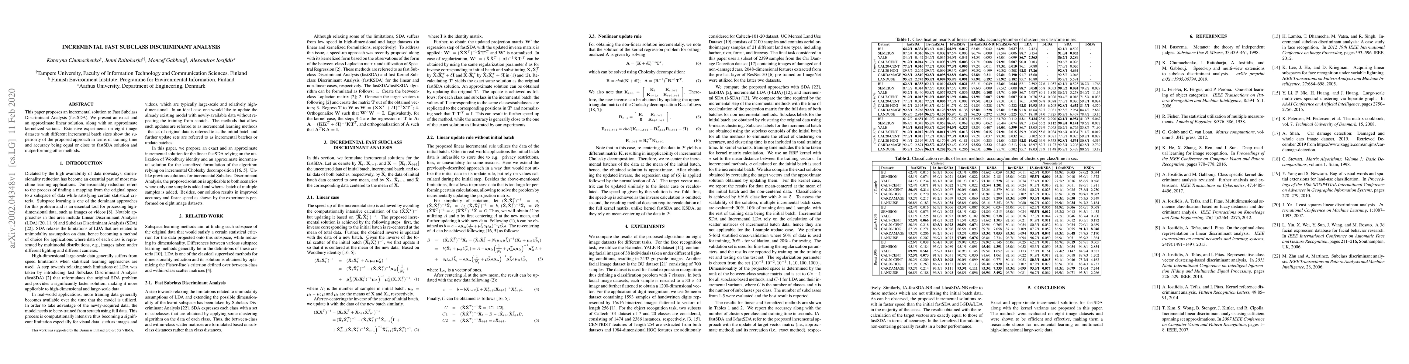 This paper proposes an incremental solution to Fast Subclass Discriminant Analysis (fastSDA), achieving comparable accuracy while reducing training time, outperforming other methods.