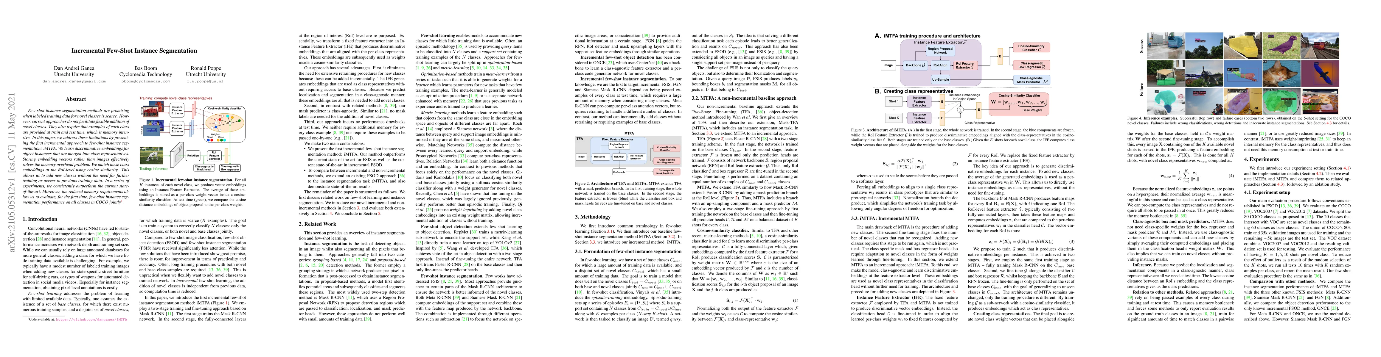 This paper introduces iMTFA, an incremental few-shot instance segmentation method that allows for the flexible addition of new classes without requiring further training or access to previous data. It addresses memory overhead by storing discriminative embeddings instead of images, outperforming current state-of-the-art methods and enabling joint evaluation on all COCO classes.