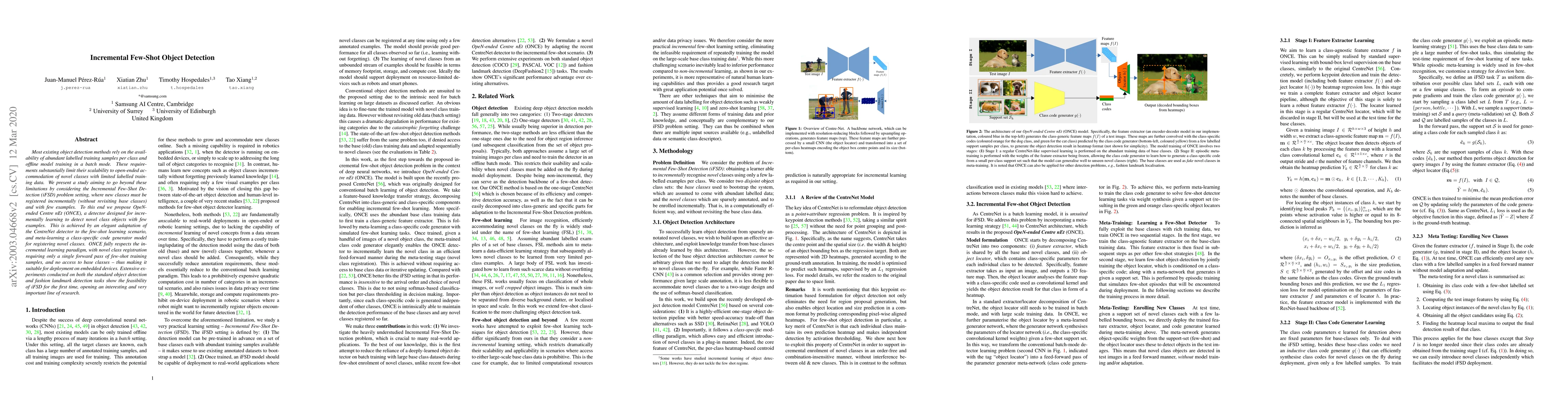 This paper introduces OpeN-ended Centre nEt (ONCE), a novel incremental few-shot detection method that enables the addition of new object classes with minimal labeled data, without revisiting previously trained classes. ONCE adapts CentreNet for few-shot learning and meta-learns a class-specific code generator, demonstrating its effectiveness on standard and fashion detection tasks.