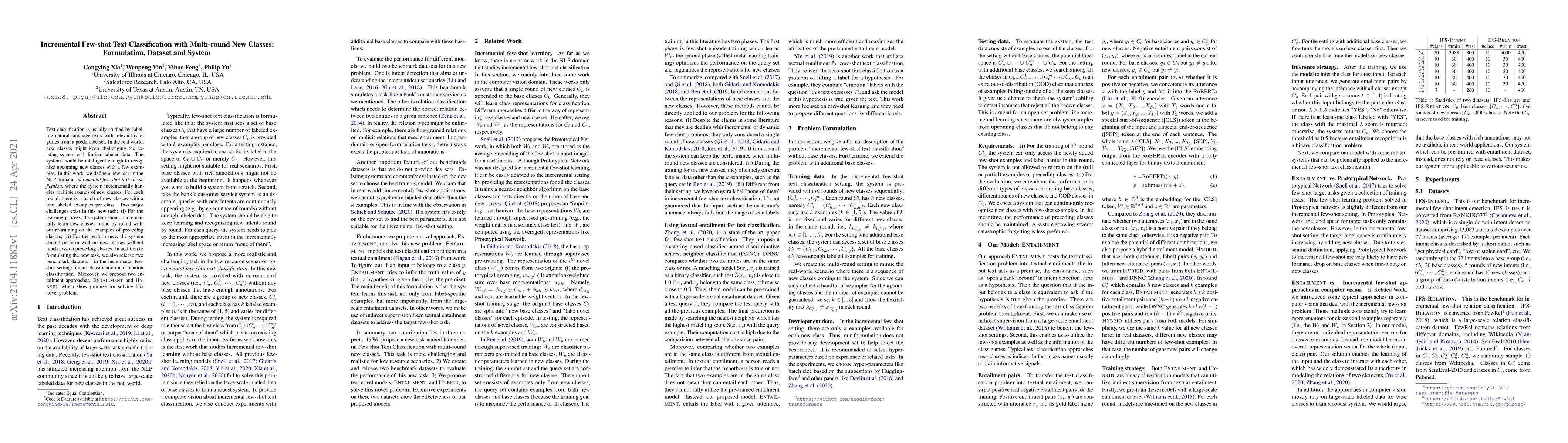 This research paper proposes a new approach to few-shot text classification that can handle multiple rounds of new classes with limited labeled data. It presents two benchmark datasets and two entailment approaches for solving the incremental few-shot text classification task.