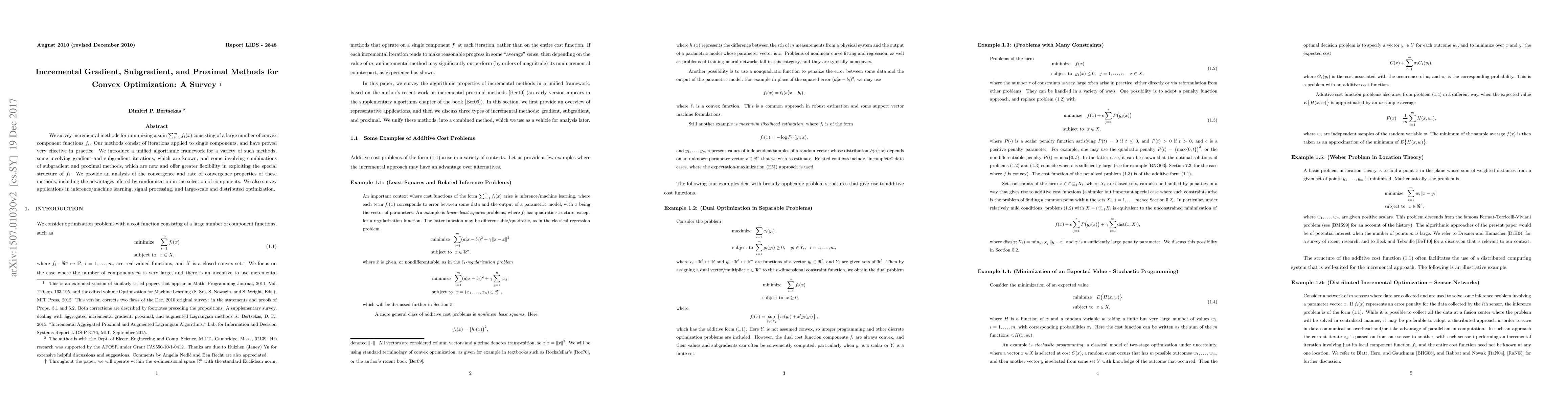 This paper surveys incremental optimization techniques for minimizing sums of convex functions, introducing a unified framework for gradient, subgradient, and proximal methods. It analyzes convergence rates and benefits of randomization, and discusses applications in machine learning, signal processing, and distributed optimization.