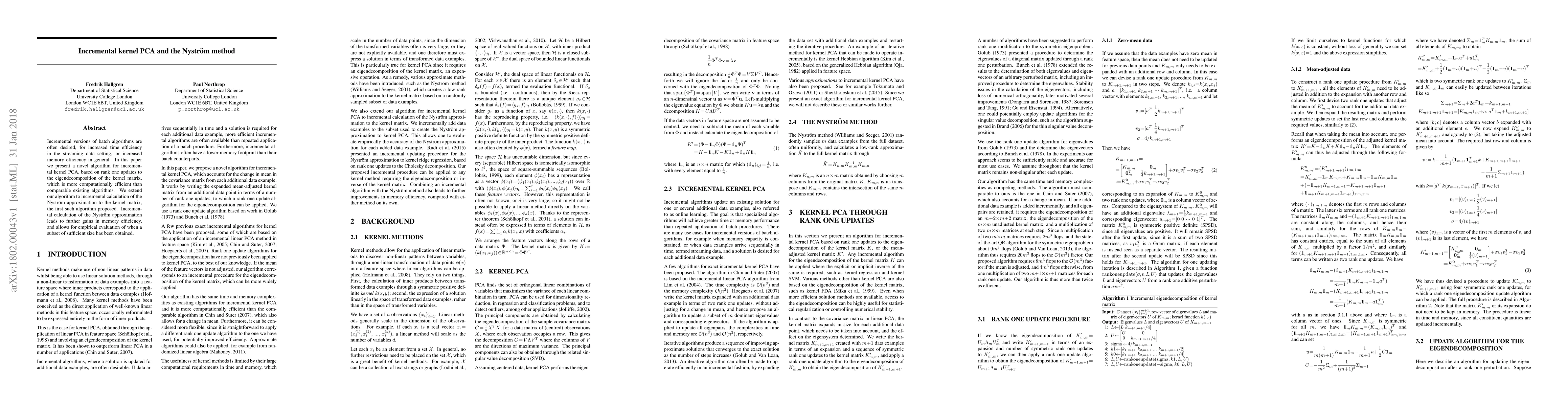 This paper introduces an efficient incremental kernel PCA algorithm using rank one updates to the eigendecomposition of the kernel matrix, and extends it to an incremental Nyström method, offering improved computational and memory efficiency in data streaming scenarios.