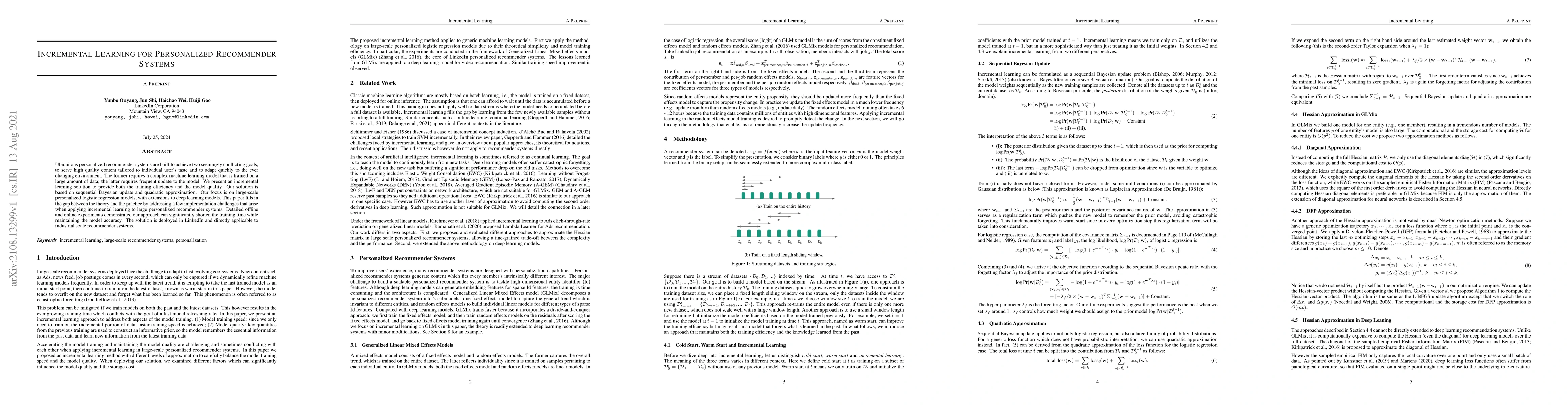 This research proposes an incremental learning method for personalized recommender systems that combines sequential Bayesian updates and quadratic approximation to efficiently update large-scale logistic regression models while maintaining high accuracy. The approach addresses practical implementation challenges and has been successfully deployed in LinkedIn's recommender system.