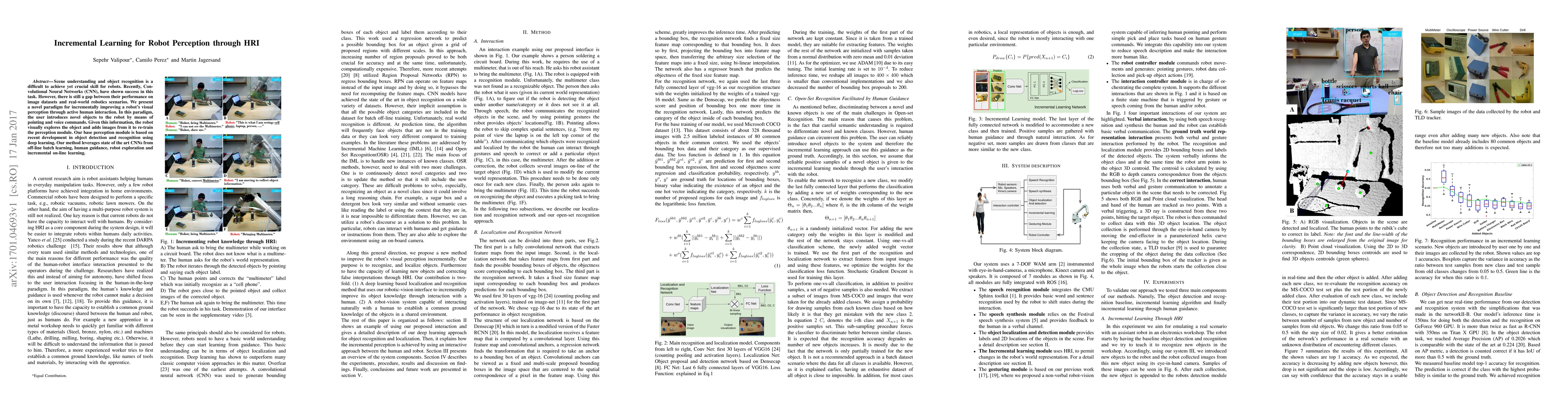 Scene understanding and object recognition is a difficult to achieve yet crucial skill for robots. Recently, Convolutional Neural Networks (CNN), have shown success in this task. However, there is still a gap between their performance on image datasets and real-world robotics scenarios. We present a novel paradigm for incrementally improving a robot's visual perception through active human interaction. In this paradigm, the user introduces novel objects to the robot by means of pointing and voice commands. Given this information, the robot visually explores the object and adds images from it to re-train the perception module. Our base perception module is based on recent development in object detection and recognition using deep learning. Our method leverages state of the art CNNs from off-line batch learning, human guidance, robot exploration and incremental on-line learning.