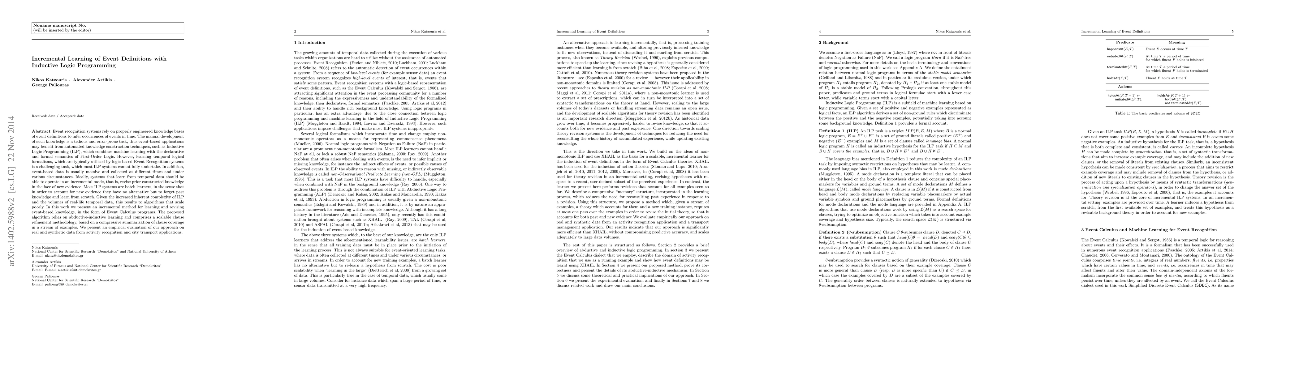 This paper introduces an incremental learning method using Inductive Logic Programming (ILP) to construct and refine event definitions in knowledge bases, aiming to address the challenges of scaling ILP to large temporal datasets. The proposed scalable clause refinement technique enables the system to adapt to new evidence without discarding prior knowledge, thereby improving performance in real-world applications like activity and transport recognition.