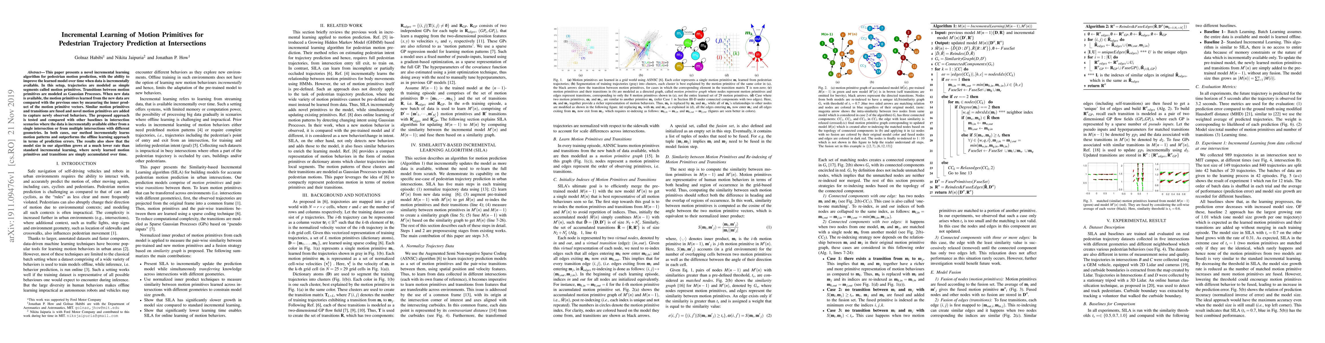 This paper introduces an incremental learning algorithm for predicting pedestrian trajectories at intersections by modeling them as motion primitives and transitions using Gaussian Processes. The method improves over time by fusing similar primitives and adding novel ones when new data is available, outperforming offline learning approaches in prediction accuracy and growing the model size more efficiently.