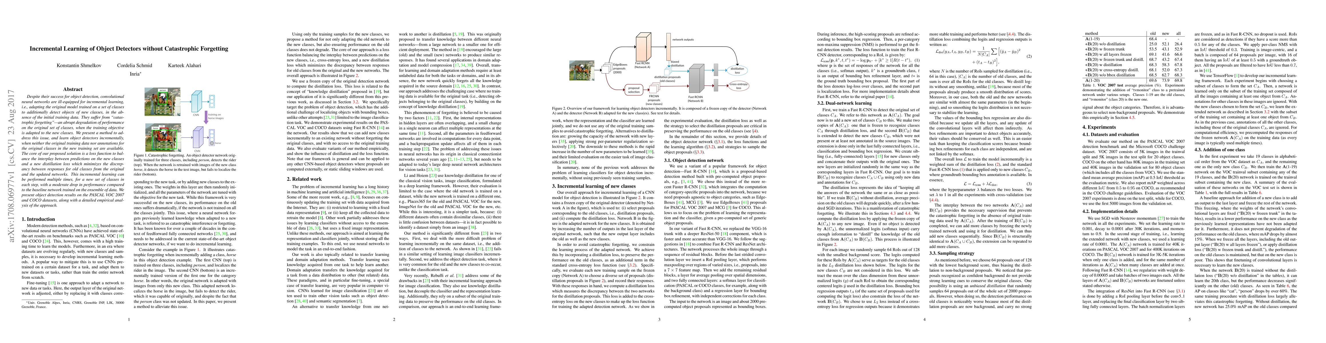 This paper proposes a method to incrementally update object detectors to recognize new classes without forgetting the original classes, addressing the issue of catastrophic forgetting. The approach uses a balanced loss function and a distillation loss to maintain performance on old classes while learning new ones.