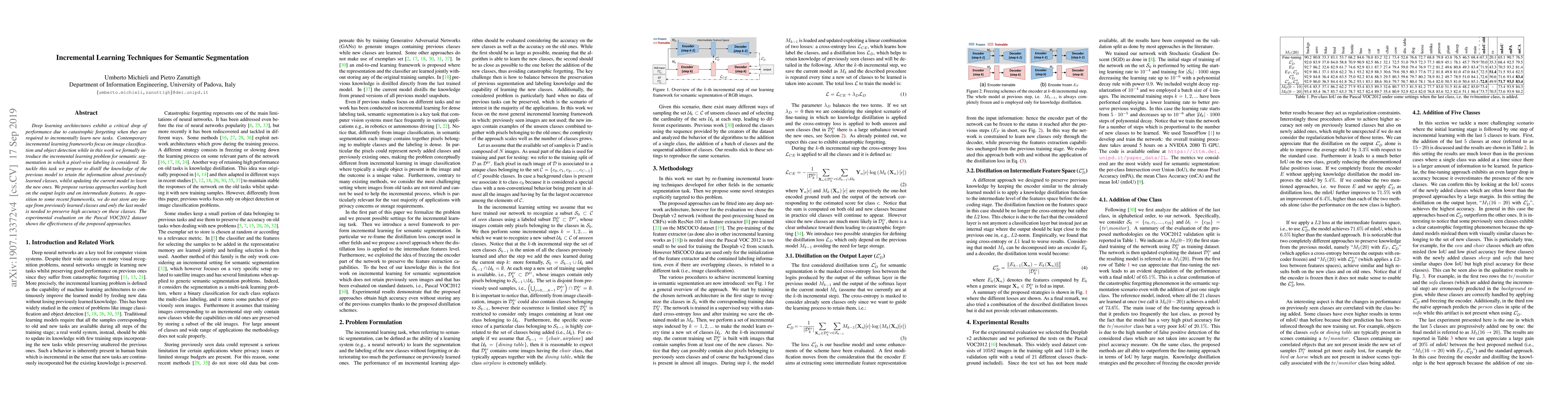 Deep learning architectures exhibit a critical drop of performance due to catastrophic forgetting when they are required to incrementally learn new tasks. Contemporary incremental learning frameworks focus on image classification and object detection while in this work we formally introduce the incremental learning problem for semantic segmentation in which a pixel-wise labeling is considered. To tackle this task we propose to distill the knowledge of the previous model to retain the information about previously learned classes, whilst updating the current model to learn the new ones. We propose various approaches working both on the output logits and on intermediate features. In opposition to some recent frameworks, we do not store any image from previously learned classes and only the last model is needed to preserve high accuracy on these classes. The experimental evaluation on the Pascal VOC2012 dataset shows the effectiveness of the proposed approaches.