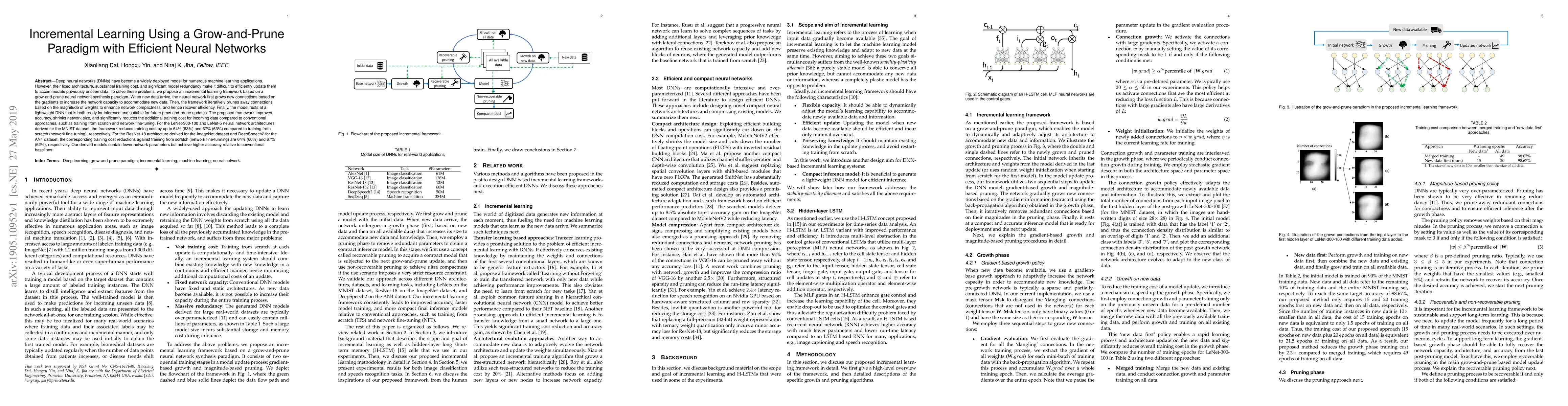 This paper proposes an incremental learning framework using a grow-and-prune paradigm to efficiently update deep neural networks with new data, achieving significant reductions in training cost and model size while maintaining or improving accuracy. The method grows new connections and then prunes them to maintain efficiency, demonstrating up to 64% reduction in training cost compared to training from scratch or fine-tuning.