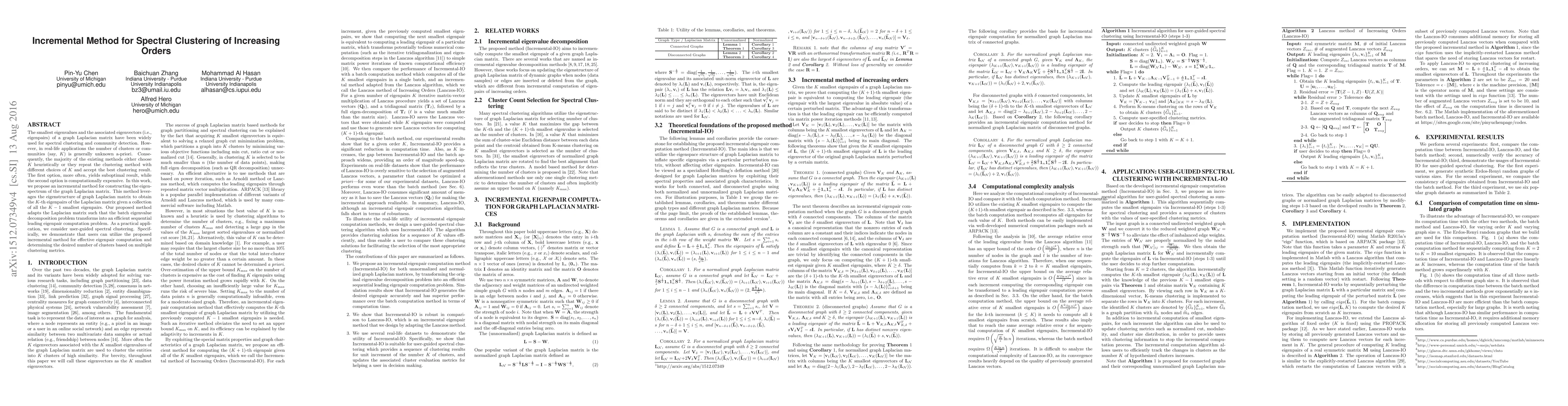 This paper introduces an incremental method for spectral clustering that efficiently computes the $K$-th eigenpairs of a graph Laplacian matrix by adapting the matrix and transforming the eigenvalue decomposition into sequential computations. The method allows users to determine the optimal number of clusters dynamically based on multiple metrics.