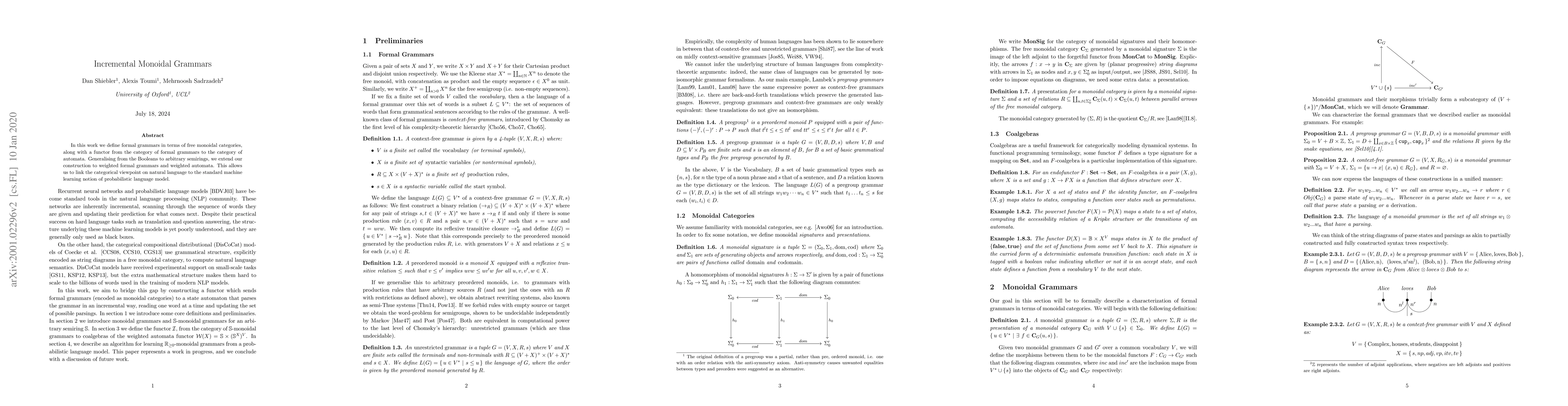 Researchers define formal grammars using free monoidal categories, linking natural language to machine learning concepts like probabilistic language models. They extend this framework to weighted formal grammars and automata, enabling new approaches to analyze and generate human language.
