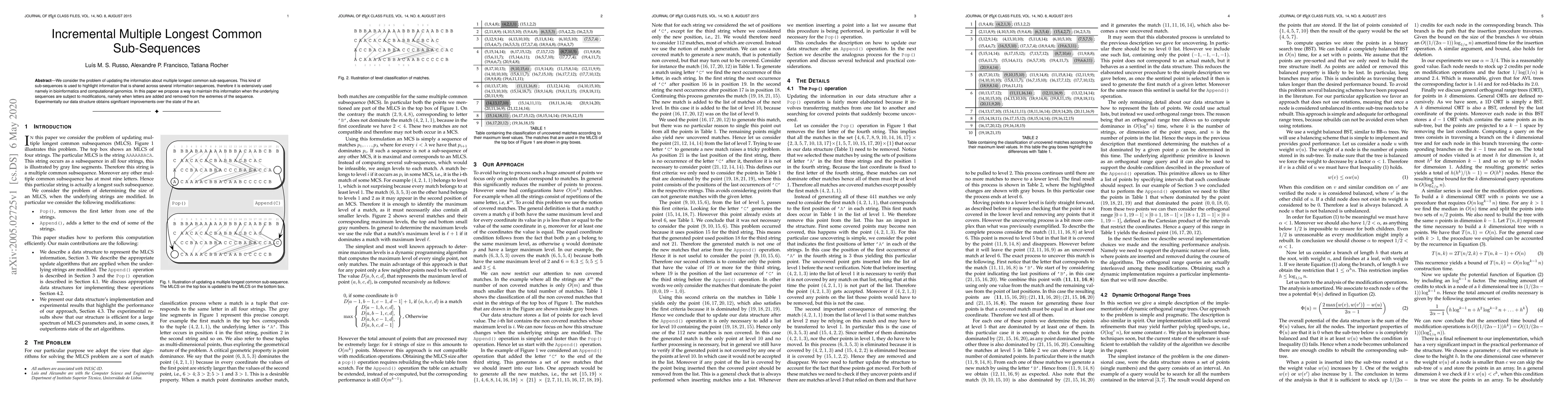 This paper proposes an efficient method for updating multiple longest common sub-sequences in bioinformatics and computational genomics when sequences are modified by adding or removing letters. The new data structure significantly outperforms existing approaches in experimental evaluations.