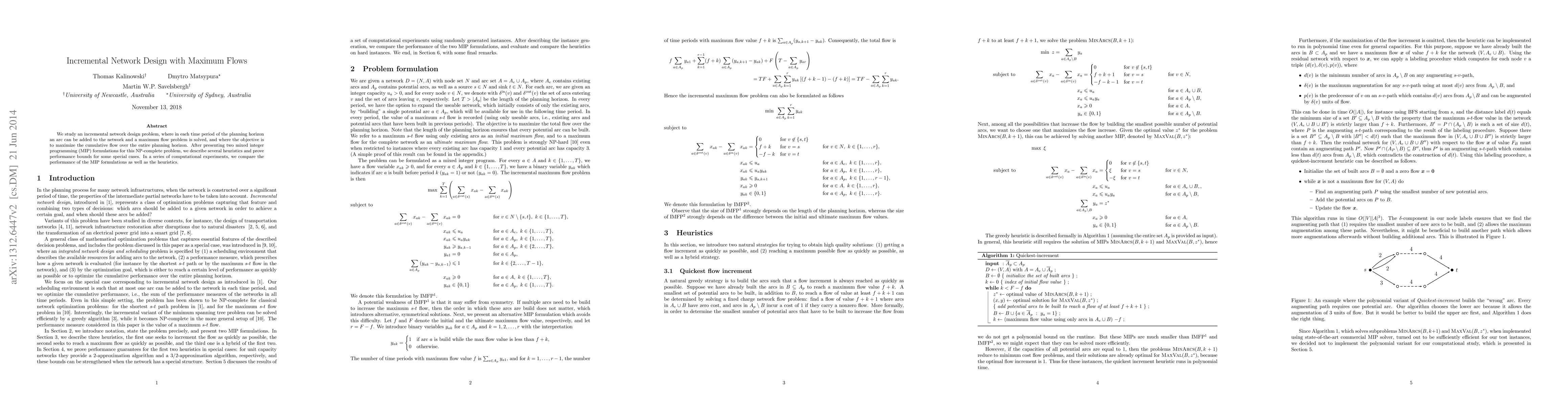 We study an incremental network design problem, where in each time period of the planning horizon an arc can be added to the network and a maximum flow problem is solved, and where the objective is to maximize the cumulative flow over the entire planning horizon. After presenting two mixed integer programming (MIP) formulations for this NP-complete problem, we describe several heuristics and prove performance bounds for some special cases. In a series of computational experiments, we compare the performance of the MIP formulations as well as the heuristics.