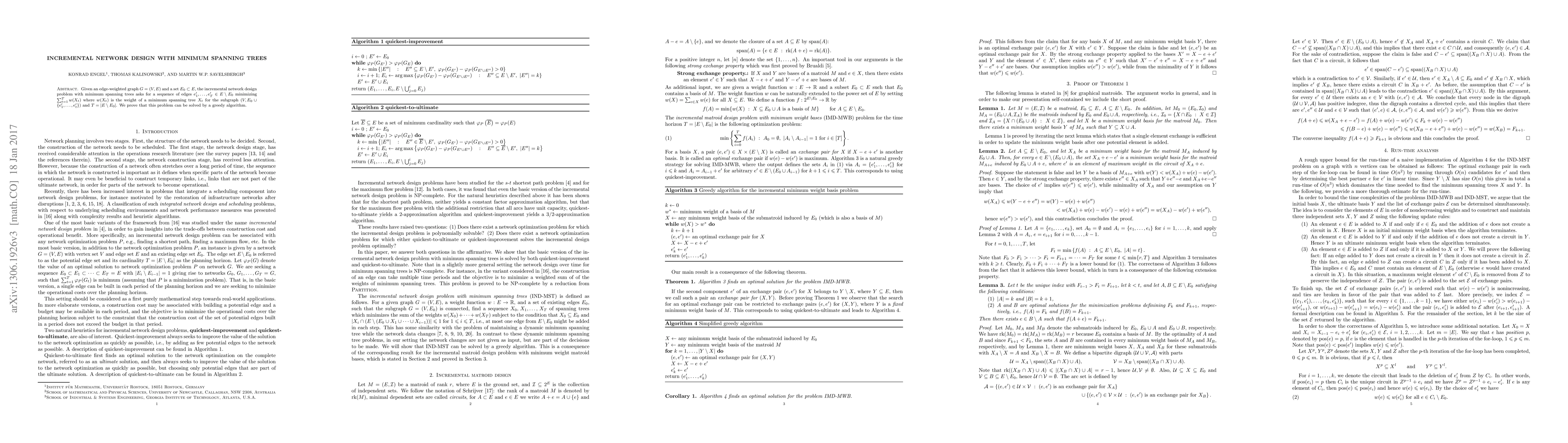 A greedy algorithm can solve the incremental network design problem with minimum spanning trees, which involves adding edges to an existing graph while minimizing the total weight of the resulting subgraphs.