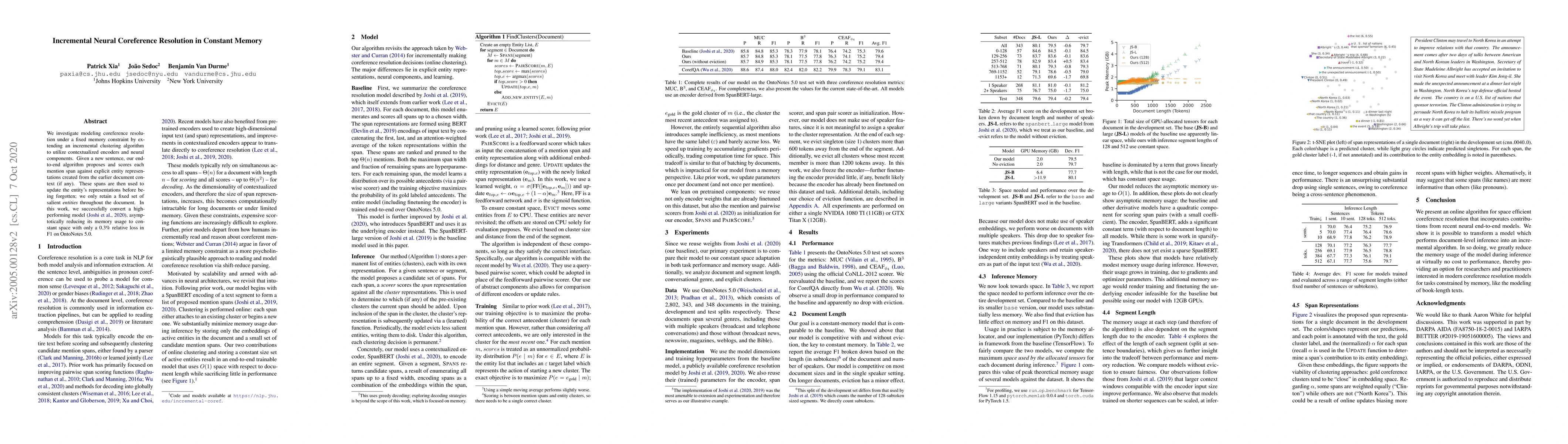 We investigate modeling coreference resolution under a fixed memory constraint by extending an incremental clustering algorithm to utilize contextualized encoders and neural components. Given a new sentence, our end-to-end algorithm proposes and scores each mention span against explicit entity representations created from the earlier document context (if any). These spans are then used to update the entity's representations before being forgotten; we only retain a fixed set of salient entities throughout the document. In this work, we successfully convert a high-performing model (Joshi et al., 2020), asymptotically reducing its memory usage to constant space with only a 0.3% relative loss in F1 on OntoNotes 5.0.