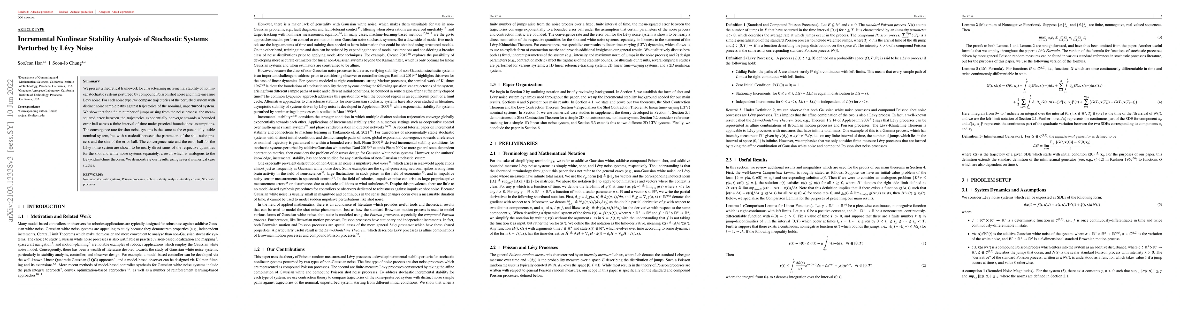 This paper develops a theoretical framework for analyzing incremental stability in nonlinear stochastic systems affected by compound Poisson shot noise and Lévy noise. It demonstrates that the mean-squared error between perturbed and unperturbed trajectories converges exponentially under boundedness assumptions, with specific convergence rates and error bounds for each noise type.