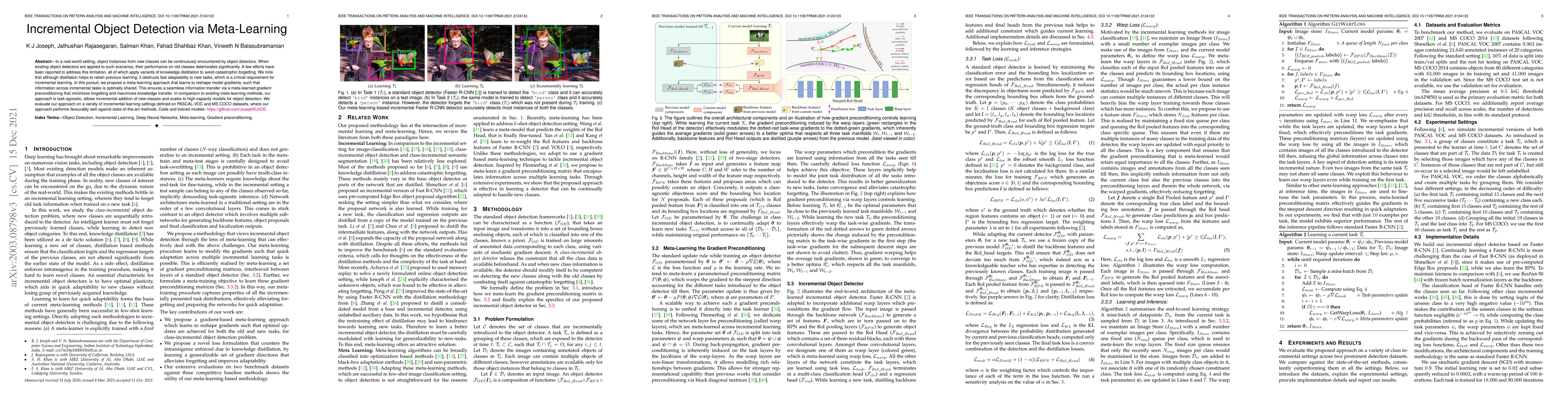 This paper proposes a meta-learning approach to incrementally detect new object classes while minimizing performance deterioration on previously learned classes. The method reshapes model gradients to optimally share information across tasks, achieving better knowledge transfer and adaptability compared to knowledge distillation.