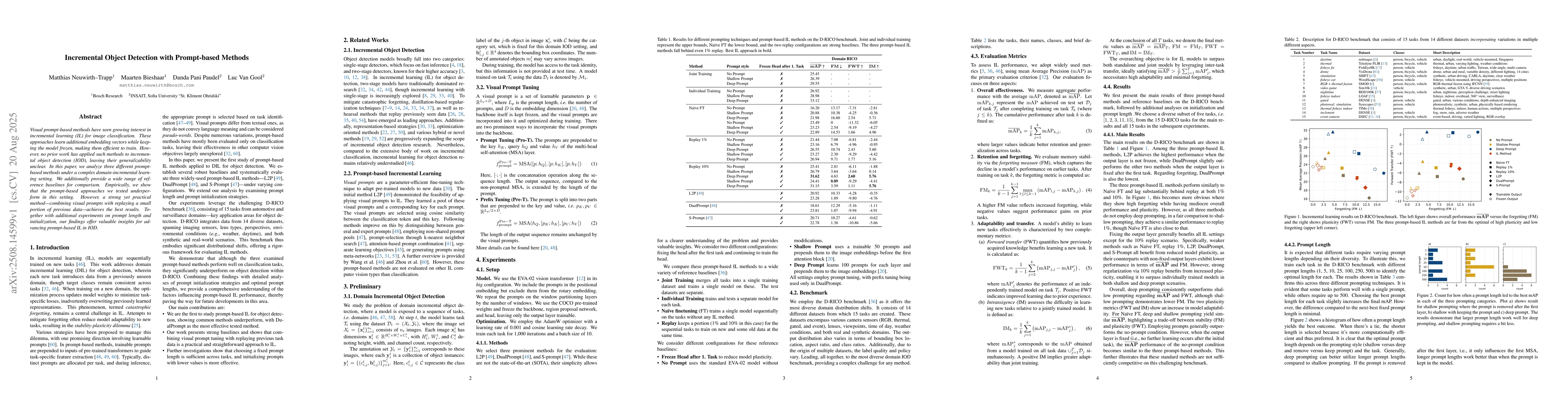 The paper analyzes three prompt-based methods for incremental object detection (IOD) under a complex domain-incremental learning setting, comparing them with various reference baselines on the D-RICO benchmark.