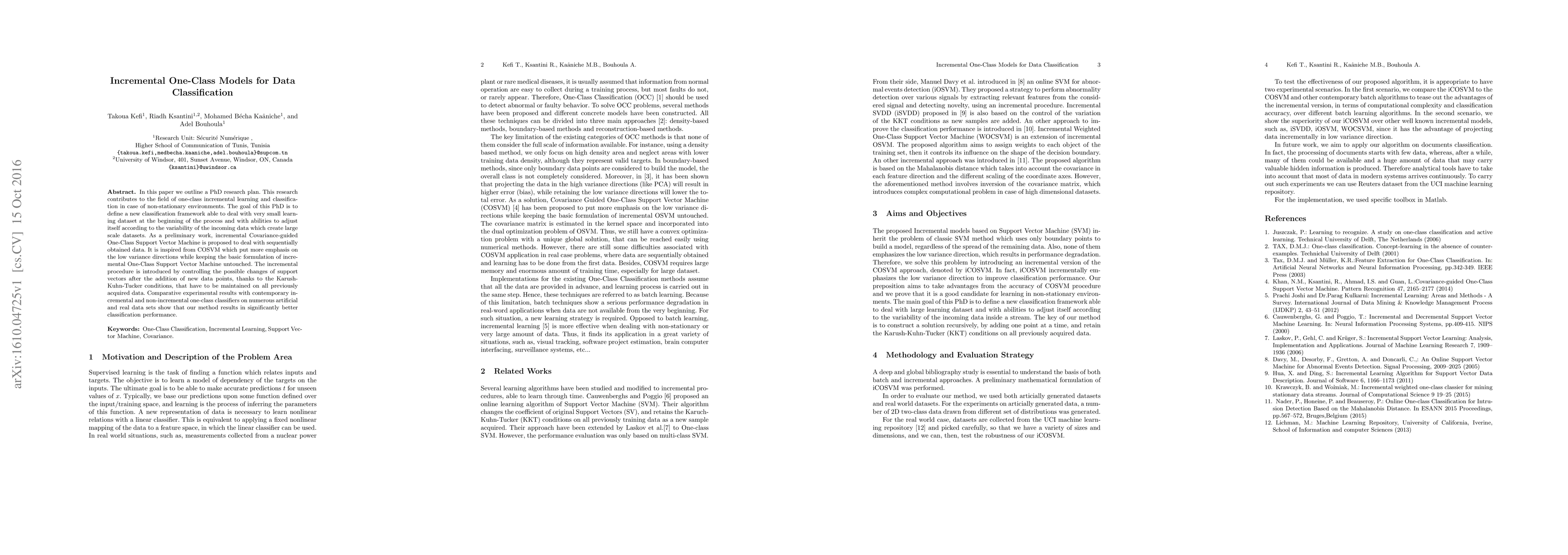 In this paper we outline a PhD research plan. This research contributes to the field of one-class incremental learning and classification in case of non-stationary environments. The goal of this PhD is to define a new classification framework able to deal with very small learning dataset at the beginning of the process and with abilities to adjust itself according to the variability of the incoming data which create large scale datasets. As a preliminary work, incremental Covariance-guided One-Class Support Vector Machine is proposed to deal with sequentially obtained data. It is inspired from COSVM which put more emphasis on the low variance directions while keeping the basic formulation of incremental One-Class Support Vector Machine untouched. The incremental procedure is introduced by controlling the possible changes of support vectors after the addition of new data points, thanks to the Karush-Kuhn-Tucker conditions, that have to be maintained on all previously acquired data. Comparative experimental results with contemporary incremental and non-incremental one-class classifiers on numerous artificial and real data sets show that our method results in significantly better classification performance.
