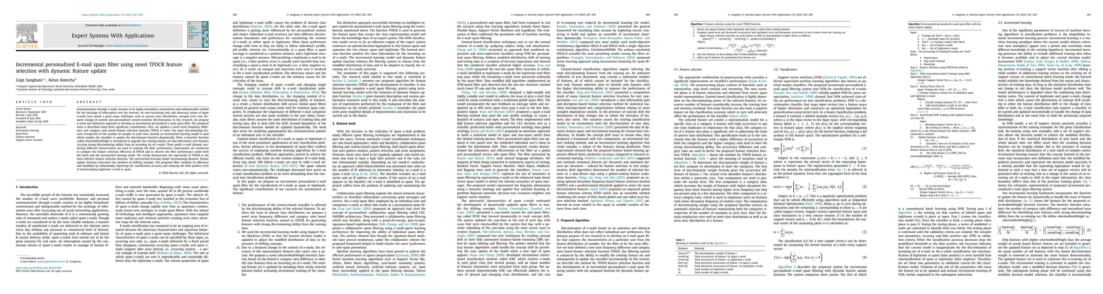 This research proposes an incremental personalized e-mail spam filter using a novel TFDCR feature selection method, an incremental learning model, and a dynamic feature update heuristic. The TFDCR method effectively selects discriminating features, while the incremental learning model dynamically updates the classifier, enhancing performance and reducing false positives.