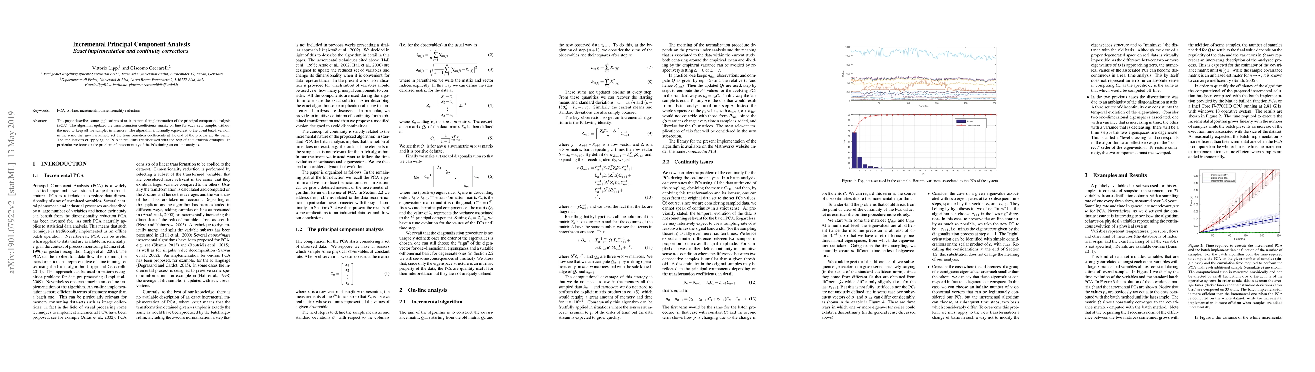 This paper presents an incremental implementation of Principal Component Analysis (PCA) that updates transformation coefficients online without storing all samples in memory. The algorithm achieves the same results as traditional batch PCA and demonstrates its applications in real-time data analysis.