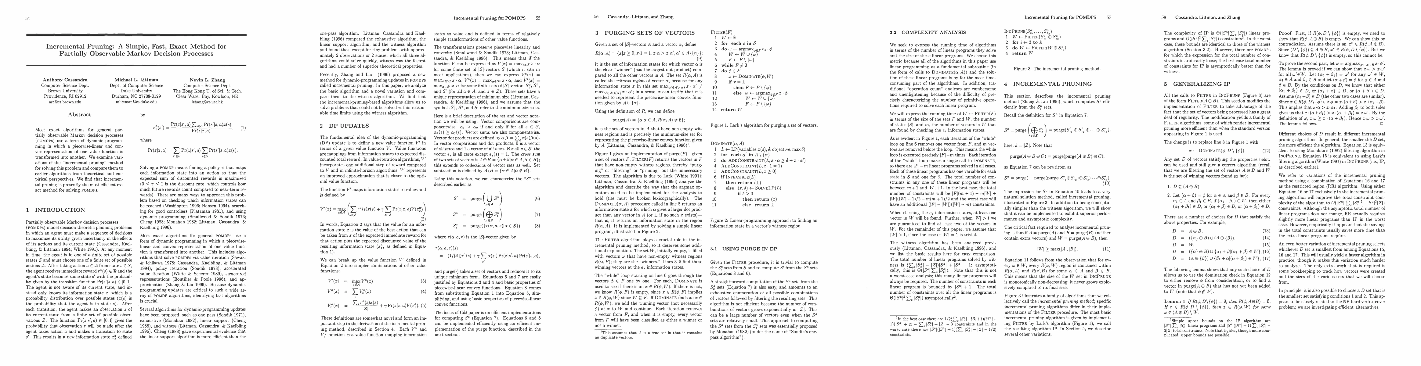 This paper introduces incremental pruning as an efficient exact method for solving partially observable Markov decision processes (POMDPs), demonstrating its superiority over previous algorithms both theoretically and empirically. The method offers a fast and precise approach to transforming value functions.