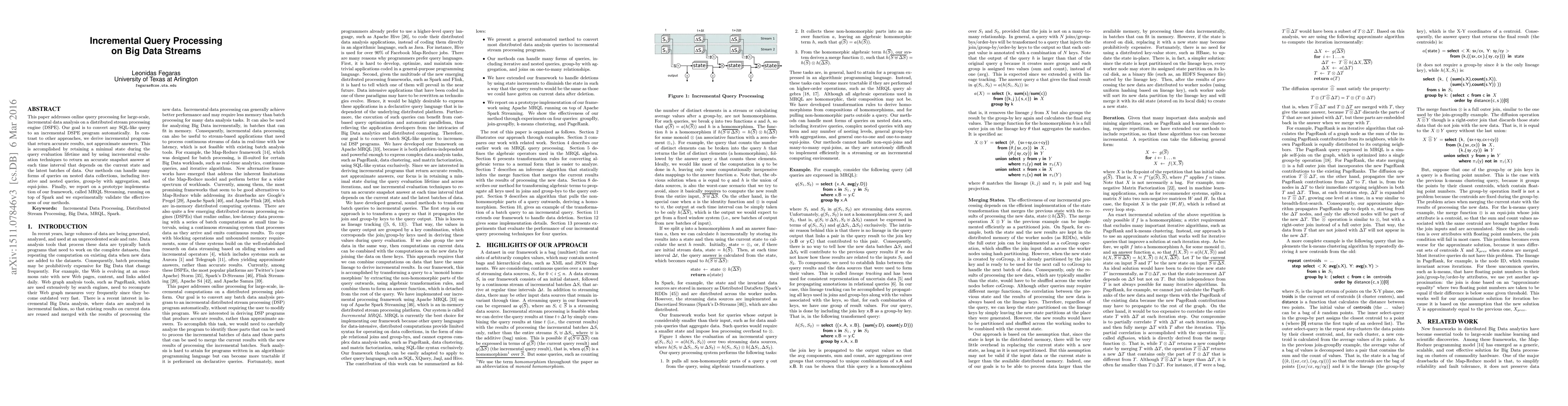This paper addresses online query processing for large-scale, incremental data analysis on a distributed stream processing engine (DSPE). Our goal is to convert any SQL-like query to an incremental DSPE program automatically. In contrast to other approaches, we derive incremental programs that return accurate results, not approximate answers. This is accomplished by retaining a minimal state during the query evaluation lifetime and by using incremental evaluation techniques to return an accurate snapshot answer at each time interval that depends on the current state and the latest batches of data. Our methods can handle many forms of queries on nested data collections, including iterative and nested queries, group-by with aggregation, and equi-joins. Finally, we report on a prototype implementation of our framework, called MRQL Streaming, running on top of Spark and we experimentally validate the effectiveness of our methods.